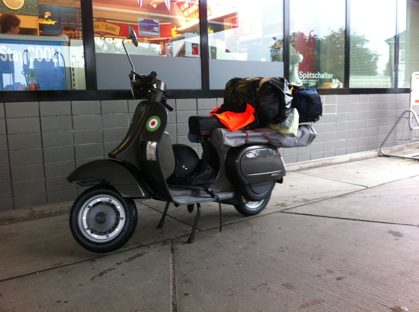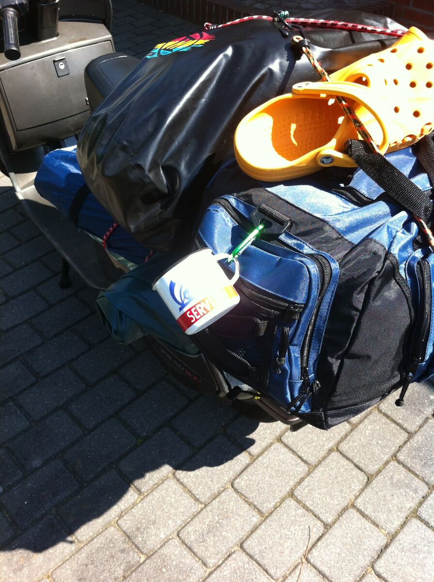 Bepacken ließ sich die PK wirklich klasse. Durch den Gepäckträger am Heck konnte ich fast alles unterbringen. Lediglich die Luftmatratze und den Schlafsack musste ich zum Tanken kurz abnehmen, weil sie auf der Sitzbank lagen. Idealerweise wäre noch der Gepäckträger am Beinschild ... den konnte ich aber vorher leider nicht mehr auftreiben.