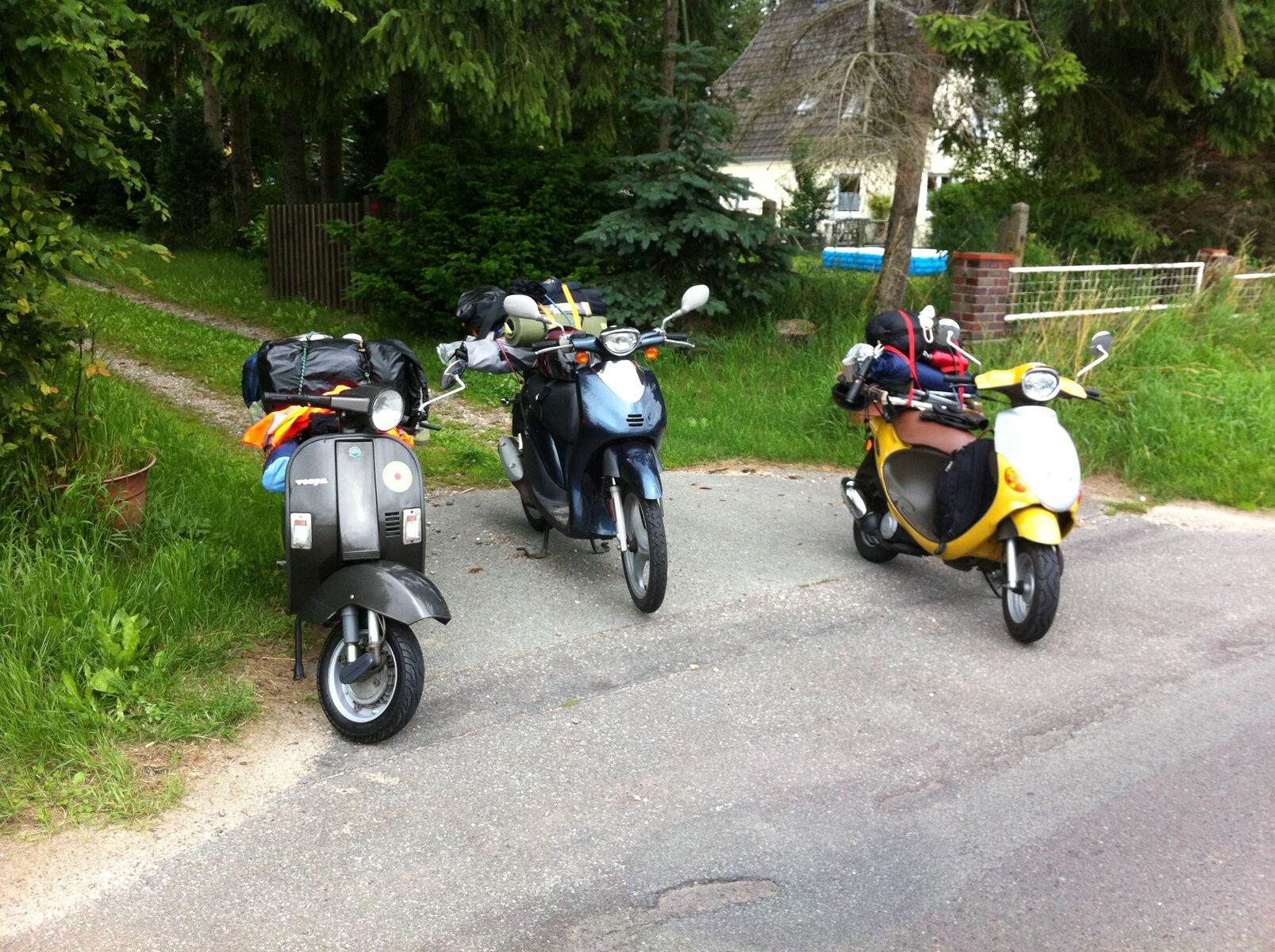Am Donnerstag ging es bei Nieselregen, der sich nach 20 km in Dauerregen verwandelte los. Ab km 50 war es dann aber nahezu trocken und wir konnten die Fahrt genießen. Vornehmlich über Kreis- und Nebenstraßen haben wir uns Stück für Stück an die Ostsee geschlichen, wobei die Kleinen (Vespa PK; Yamaha ; PGO) richtig gut liefen. 50 - 55 km/h liefen sie fast immer, es sei denn es ging bergauf.