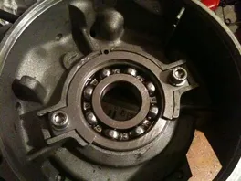 Der Profi hat scheinbar den kupplungsseitigen Seegerring nicht vorher demontiert und das Lager so stark gegen den Ring gepresst, dass bis auf eine kleine Ecke oben rechts fast der komplette Kragen von dem Seegerringsitz abgeschert ist. Zwar hält der Ring noch halbwegs aber ich möchte nicht wissen, was bei Wärme und Vibrationen passiert.