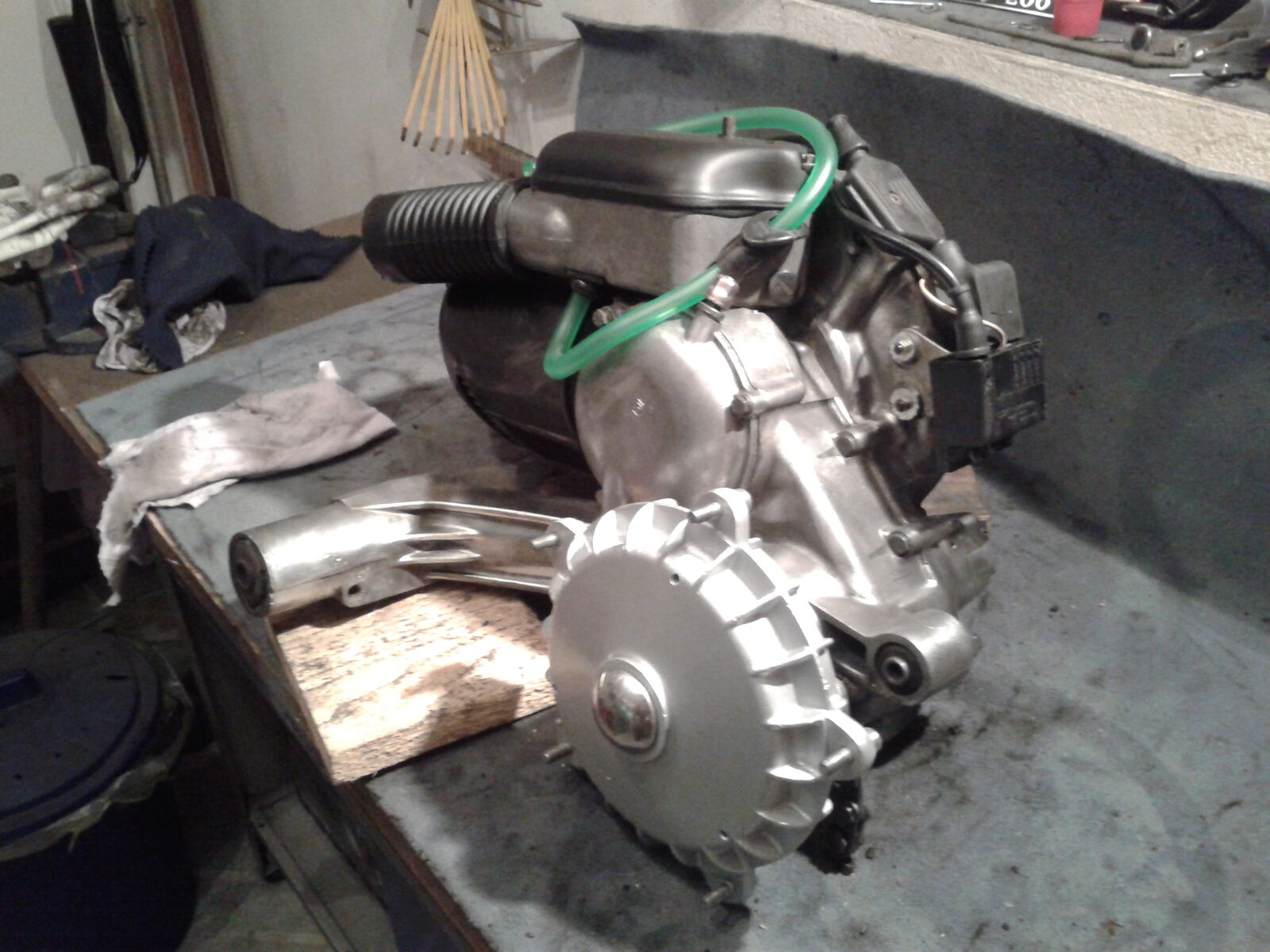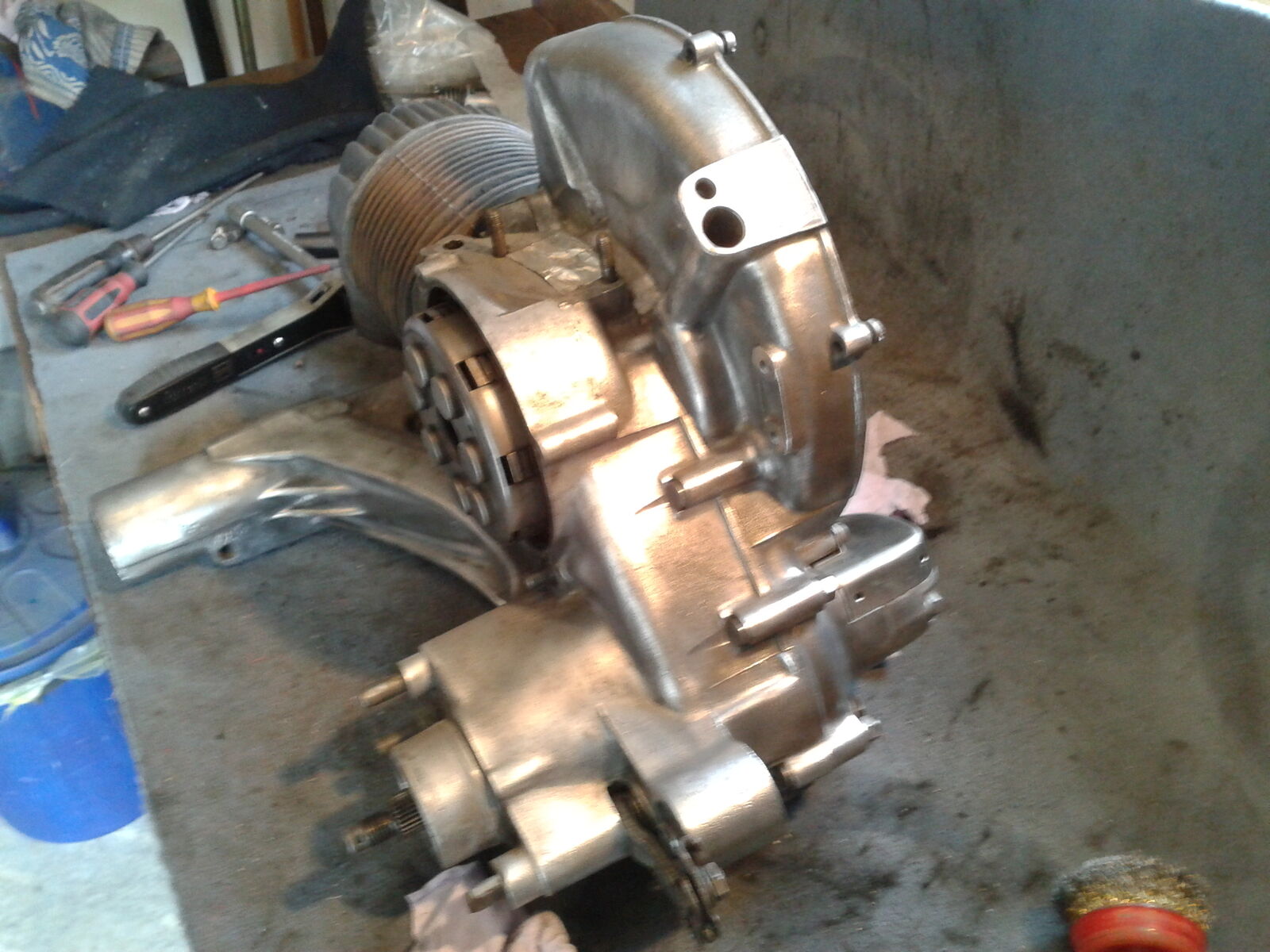 Zwischenstand: Motor ist einbaufertig und glänzt nach gut 2-stündiger und weiterer Bearbeitung mit einer Messingzopfbürste wieder richtig blinbling. Kabelbaum, Züge und Gummiteile habe ich gestern eingezogen. Hat mich echt gewundert, wie einfach das ging. Ist bei einer Smallie wesentlich beschissener... Um den 12 V-Spannungsregler und das Blinkrelais unterzubringen und nicht unbedingt mehrere zusätzliche Löcher zu bohren, habe ich das alte und nicht mehr genutzte Spannungsregler-Halteblech aus meiner V50 Spezial im Batteriehalter untergebracht. Passt gut! Foto folgt.