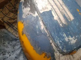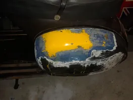 Aber trotzdem 3-4 beschissene Stunden habe ich heute oben mit der Backe zugebracht. Booooaarr was für eine scheiss Arbeit mit den 4 Farbschichten (Schwarz, dickes fieses Weiss, Blau und die Grundierung) Das schlimmste ist die graue Grundierung. Arschfest das Zeugs. Musste mit dem Metallspachtel richtig heftig kratzen. Den interessiert das Nitro nicht sonderlich. Aber der Ori-Lack scheint einiges abzukönnen. An der freigelegten Stelle an der Backe (und da ist echt toller O-Lack überall) ist es nur etwas stumpf geworden. Das war aber nicht das Nitro und auch nicht der Spachtel. Das war ich Vollidiot mit nassem 400er Schmirgel, weil ich noch ein paar Grundierungsreste weg kriegen und nicht schon wieder Nitro draufballern wollte.... 3 Stunden Arbeit in 1 Minute versaut, da jetzt natürlich der Klarlack ab ist...