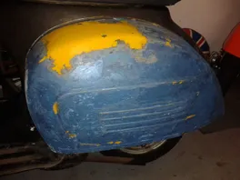 Beim Zuschweissen der Frankenstein-Blinkerlöcher hat sich doch recht viel vom O-Lack verabschiedet. Zu allem Überfluss sind nun auf jeder Seite auch je 3 Bohrlöcher aufgetaucht, die schön mit beschissenem Spachtel zugemacht und eben von den Lackschichten vorher verdeckt waren. Die müssen auch noch geschweisst werden, von den je 2 Löchern im vorderen Koti mal abgesehen. Manmanman...Und nun hat sich auch rausgestellt, dass auf dem Trittschild und Rahmentunnel nix mit O-Lack ist und nur beschissene graue Grundierung. Vom Lenker (das wusste ich aber vorher schon), wo gar nix mehr drauf ist, mal ganz abgesehen. Da ist auch nichts mehr mit ein bißchen Beilackieren.