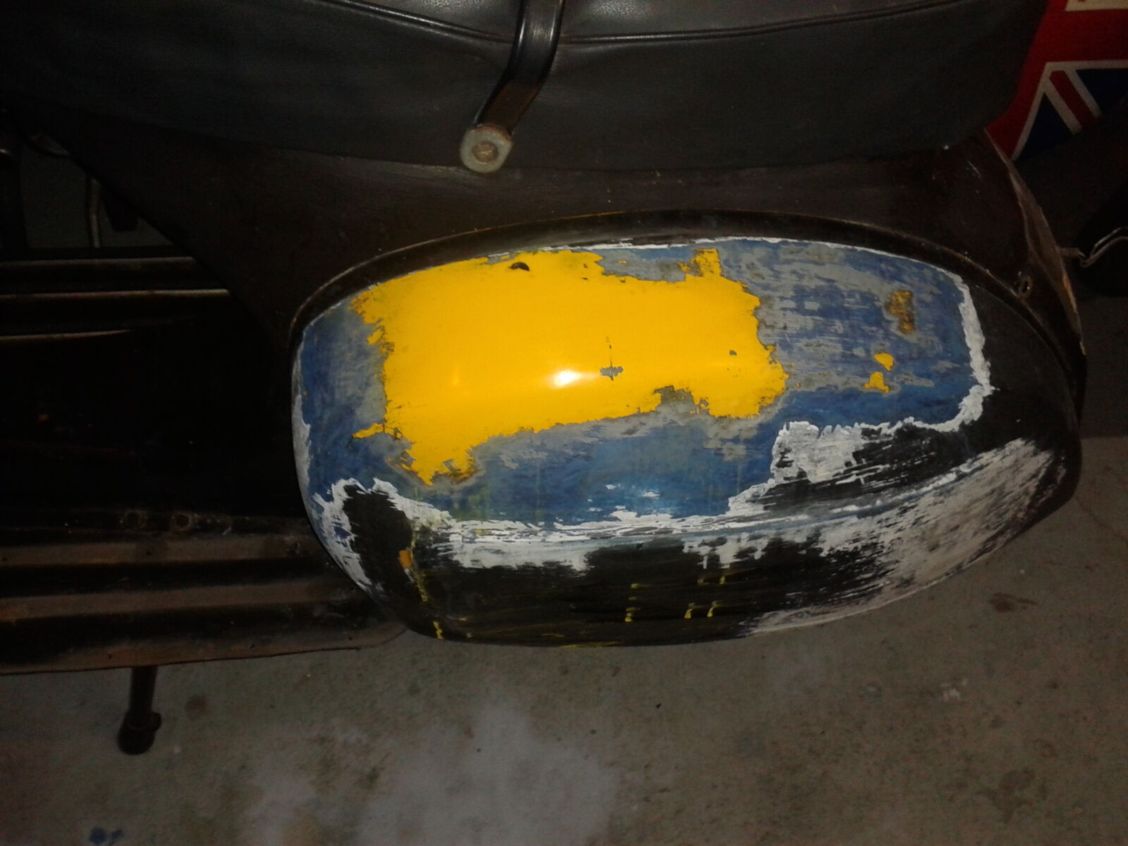 Und nun hat sich auch rausgestellt, dass auf dem Trittschild und Rahmentunnel nix mit O-Lack ist und nur beschissene graue Grundierung. Vom Lenker (das wusste ich aber vorher schon), wo gar nix mehr drauf ist, mal ganz abgesehen. Da ist auch nichts mehr mit ein bißchen Beilackieren.