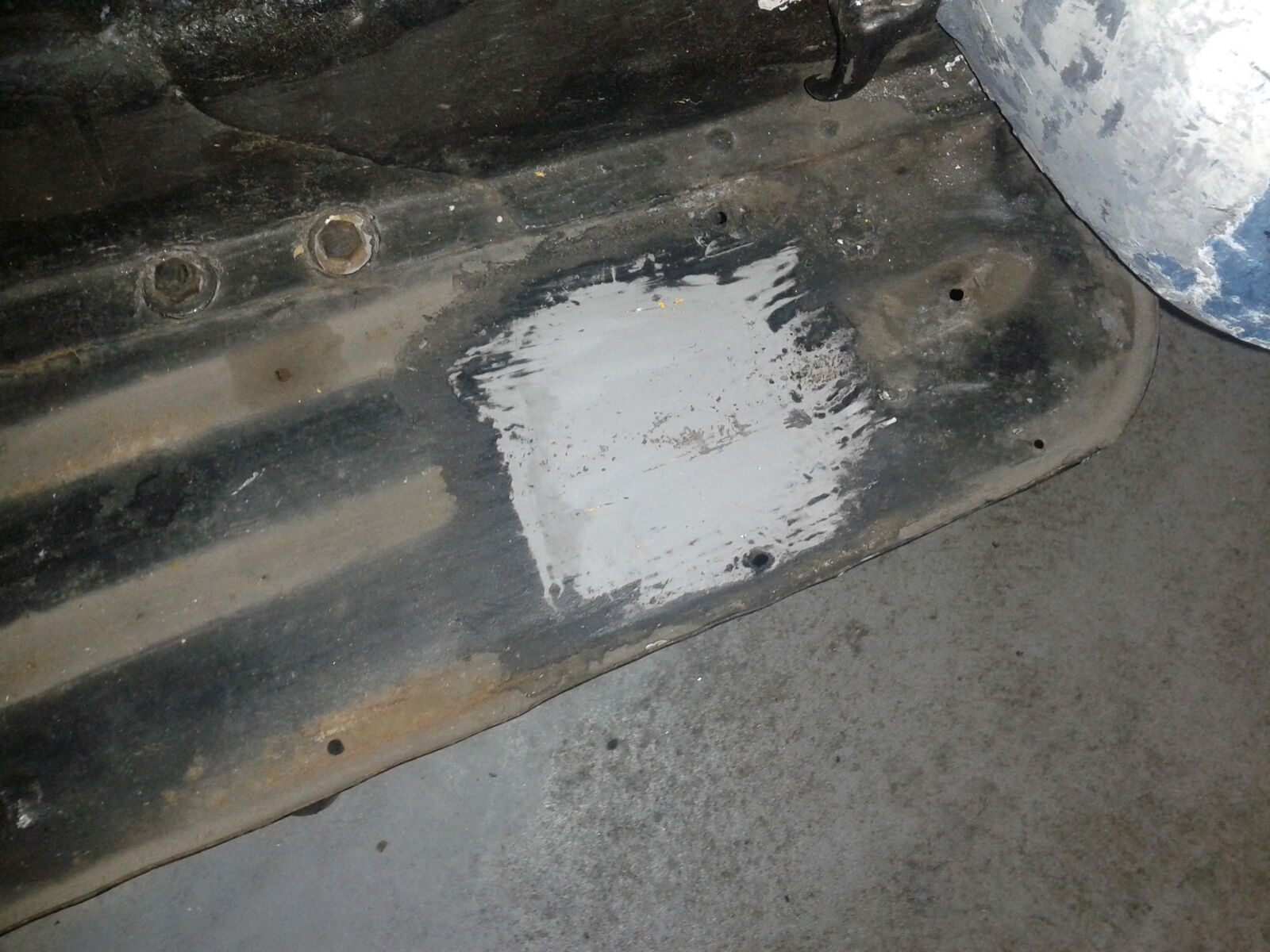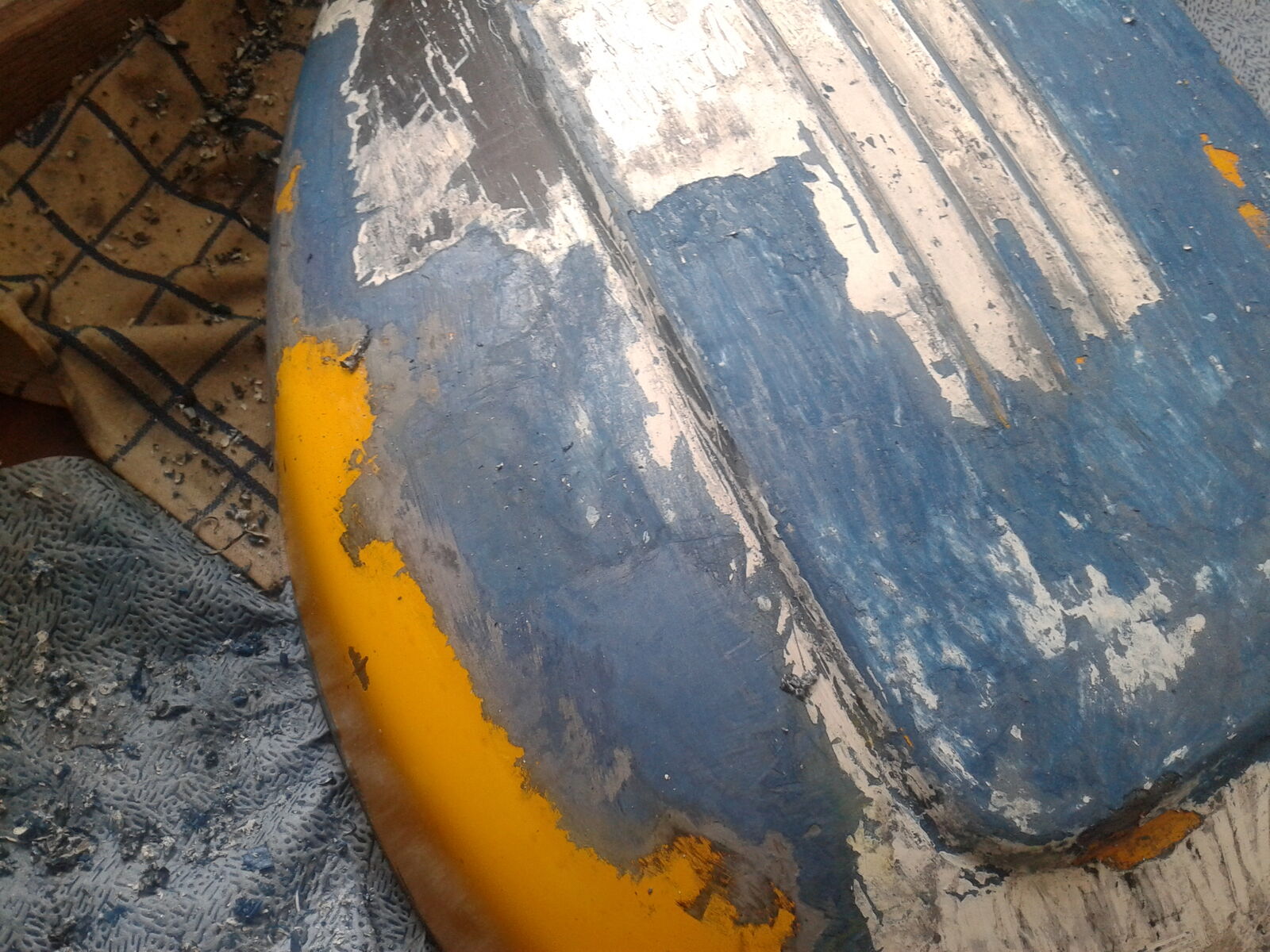 Anders werde ich dieser beschissen weissen Farbschicht kaum Herr. Die ist schon etwas gummimäßig, ähnlich wie Latexfarbe oder sowas. Keinen Plan, warum die das da damals draufgepampt haben. Jedenfalls habe ich heute an der Backe noch einiges geschafft. Schwarze Farbe ist nun ganz ab, diese fiese weisse zu 90% und jetzt kommt dann eben noch die blaue Farbe und die ober-assi-Grundierung.