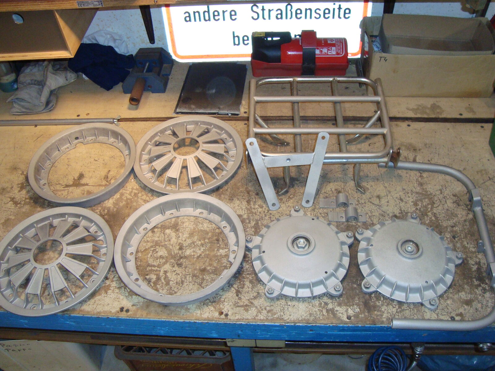 Die Trommeln,Ständer,Gepäckträger und die PX Alufelgen.