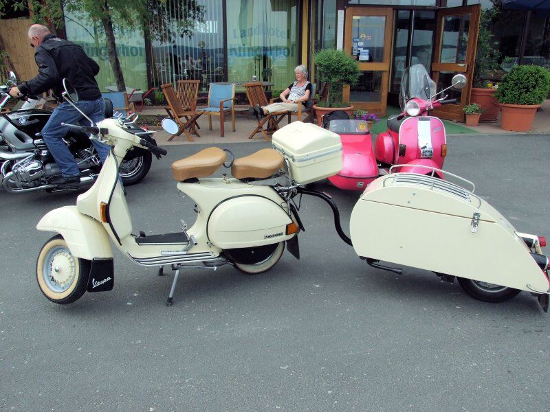 Der Onkel von nem Kumpel hat sich so en Anhänger selbst gebaut, so ein beiger Anhänger mit ner beigen Vespa, den hast du glaub ich auch beim Oldtimertreffen fotografiert