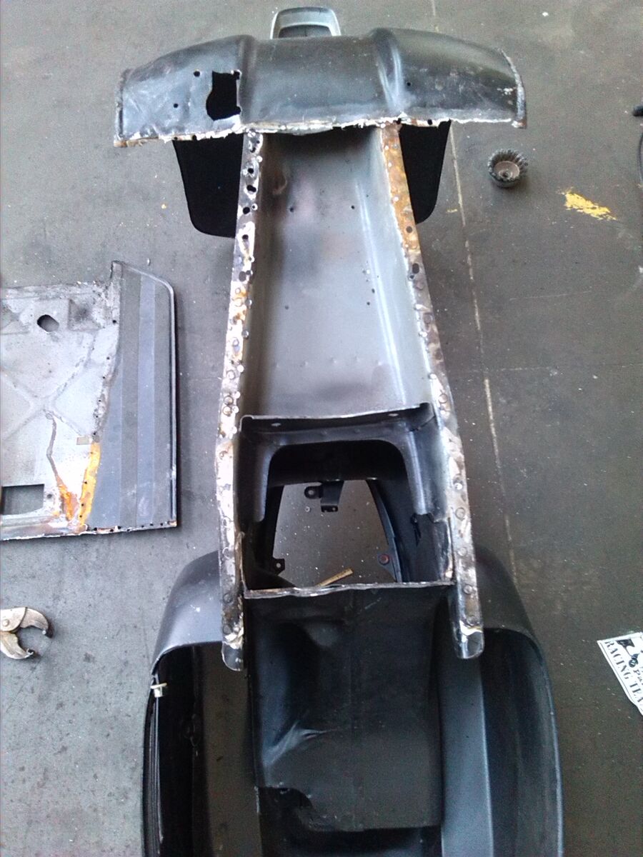 war mal ein ESC roller und soll jetzt mit leichten racing anleihen zurück auf die straße. rahmen ist "fast" in nem guten zustand. also wenig beulen, fast kein rost und keine welle hinterm kotflügel. nur das trittblech wurde sehr dilletantisch verschweißt und mit sikaflex verklebt. :wacko: ausserdem wurde das loch für die fußbremse...sagen wir mal nach augenmaß ausgeschnitten.