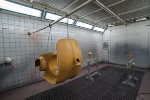 Lager und Wellendichtringe montiert, im Montageständer eingespannt