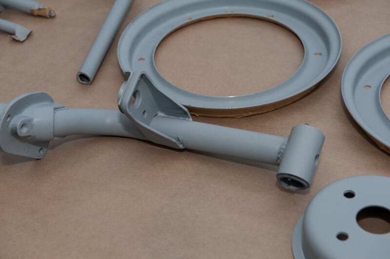 die gestrahlten Fahrwerksteile in der Lackierkabine, die etwas dunklere Farbe kommt vom Säurebad, in dem sie noch zum entrosten waren. In ein paar Rostporen meinte man noch verbliebenen Rost erkennen zu können, da war das Säurebad als Sicherheit gedacht.