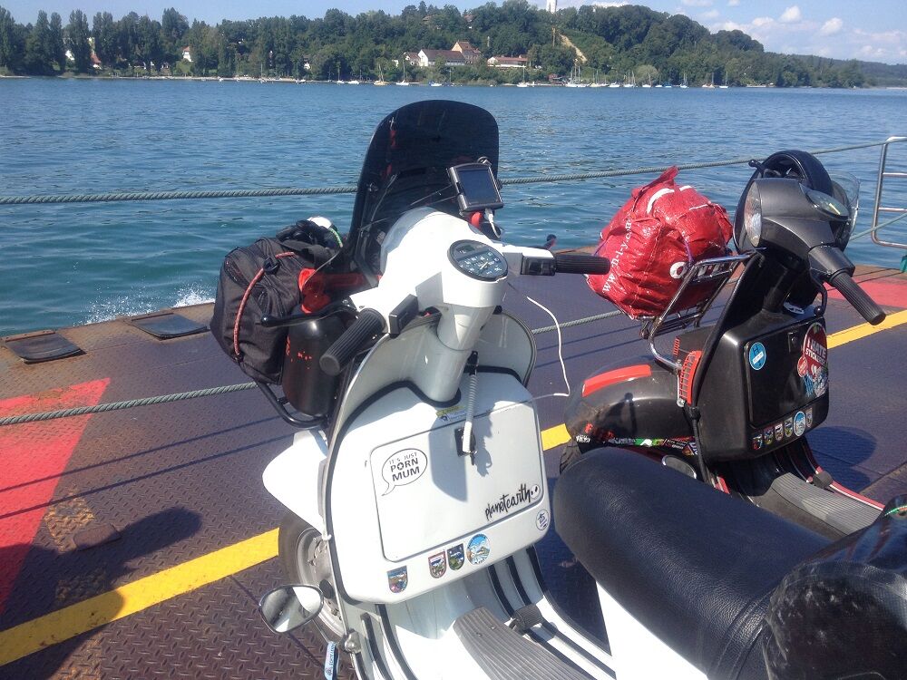Da wir keinen speziellen Plan haben, wie wir eigentlich fahren und was wir sehen wollen, empfiehlt uns Mo eine Route am Vierwaldstättersee entlang, über den Furkapass und ins Binntal nahe Andermatt. Dort campt sein Vater und sehnt sich nach dem Ersatzteil für seine Kaffeemaschine. Wir entschliessen uns, den Besuch bei meiner Mutter im Domleschg einen Tag zu verschieben und über das Wallis Richtung Graubünden zu fahren. Wir packen die Roller, nehmen die Fähre von Meersburg nach Konstanz und freuen uns, weil wir übersehen werden. (und wann tut man das schon mal als Zweiradfahrer? :rolleyes: )