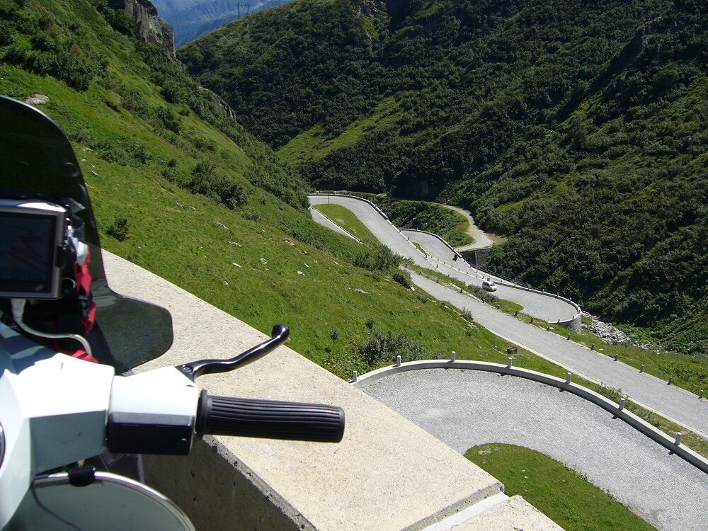 Vor einem Krankenwagen fahren wir ins Tal (man möchte da oben echt keinen Notfall erleben) schlendern durch die Stadt, kaufen ein Eis, freuen uns, dass bei der Abfahrt eine PX neben uns parkt (im Gegensatz zu vor 5 Jahren scheinen die Vespas hier nun endgültig aus dem Stadtbild verschwunden zu sein: vermutlich war Borletti hier ?( ) und fahren wieder über die Grenze und über den Malojapass. Gegen den gewaltigen Splügen ist der kleine Maloja eine Art Schluckauf :)