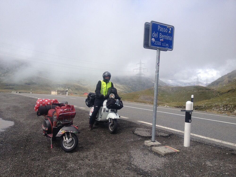 Wir fahren einfach nur in einer riesigen Wolke herum. Auf der Passhöhe ist es saukalt. Wir überqueren wieder die italienische Grenze, der Blick zum Stilfser Joch ist mehr als bescheiden: Schnee, Wolken, Nebel. Ach, egal! So hoch waren wir noch nie mit den Rollern: über 2700m. Wir beißen die Zähne zusammen und fahren in den Graupelschauer :pinch: