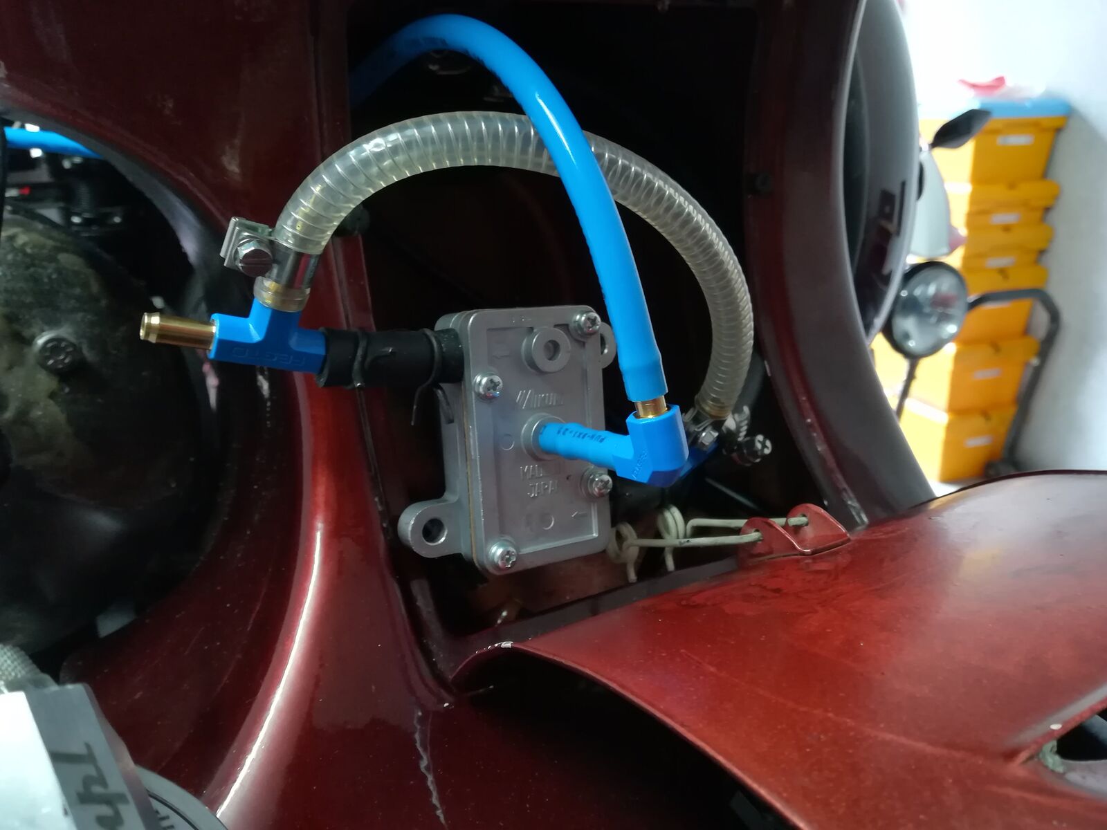 Einzug hält nun eine Membranpumpe von Mikuni. Rücklauf ist mit einer Reduzierhülse versehen. Bin gespannt wie das alles dann hin haut, und ob überhaupt. Eine Halterung werde ich mir auch noch zimmern.