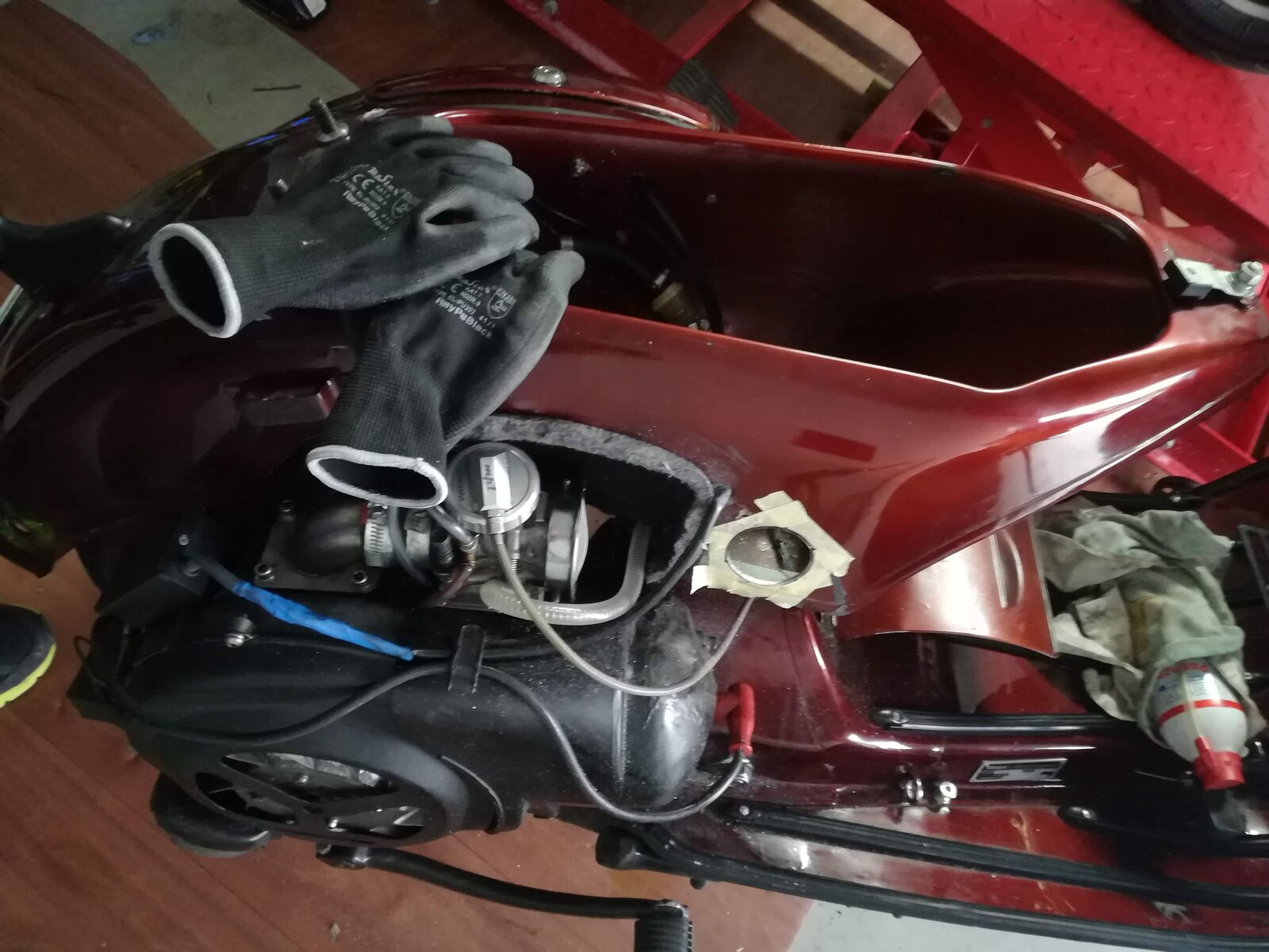 • Nachdem ich mit´m Kumpel (dem gehört die weiße GTS 300 mit Malossi und pipapo und die Verde Mela mit Quattrini m1 56l) ein wenig rum gealbert habe, stellte sich raus dass meine GS doch nicht soooo gut geht mit knapp 29PS. Vor allem hatte ich dann mega Kupplungsprobleme. Mir drückt es, wie im PX Motor Thread, bei hoher Drehzahl auch das Motoröl über die Entlüfterschraube raus. Somit zu wenig Öl irgendwann und schlecht bis nicht mehr trennende Kupplung.