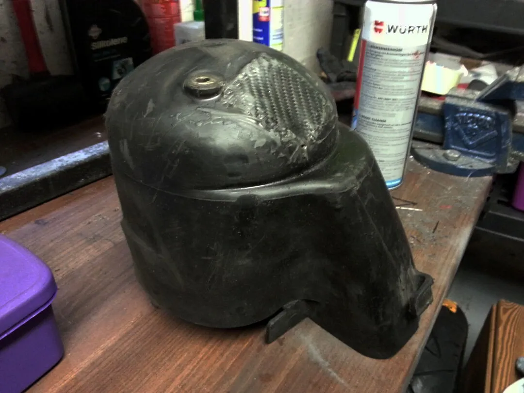 Da der M1X Zentralkerze hat, passt natürlich die originale Haube nicht mehr. Da ich nicht gewillt bin dort Geld auszugeben hab ich das vorhandene Loch mit CKF und Harz verschlossen und ein neues Loch in der Mitte der Hutze gemacht.