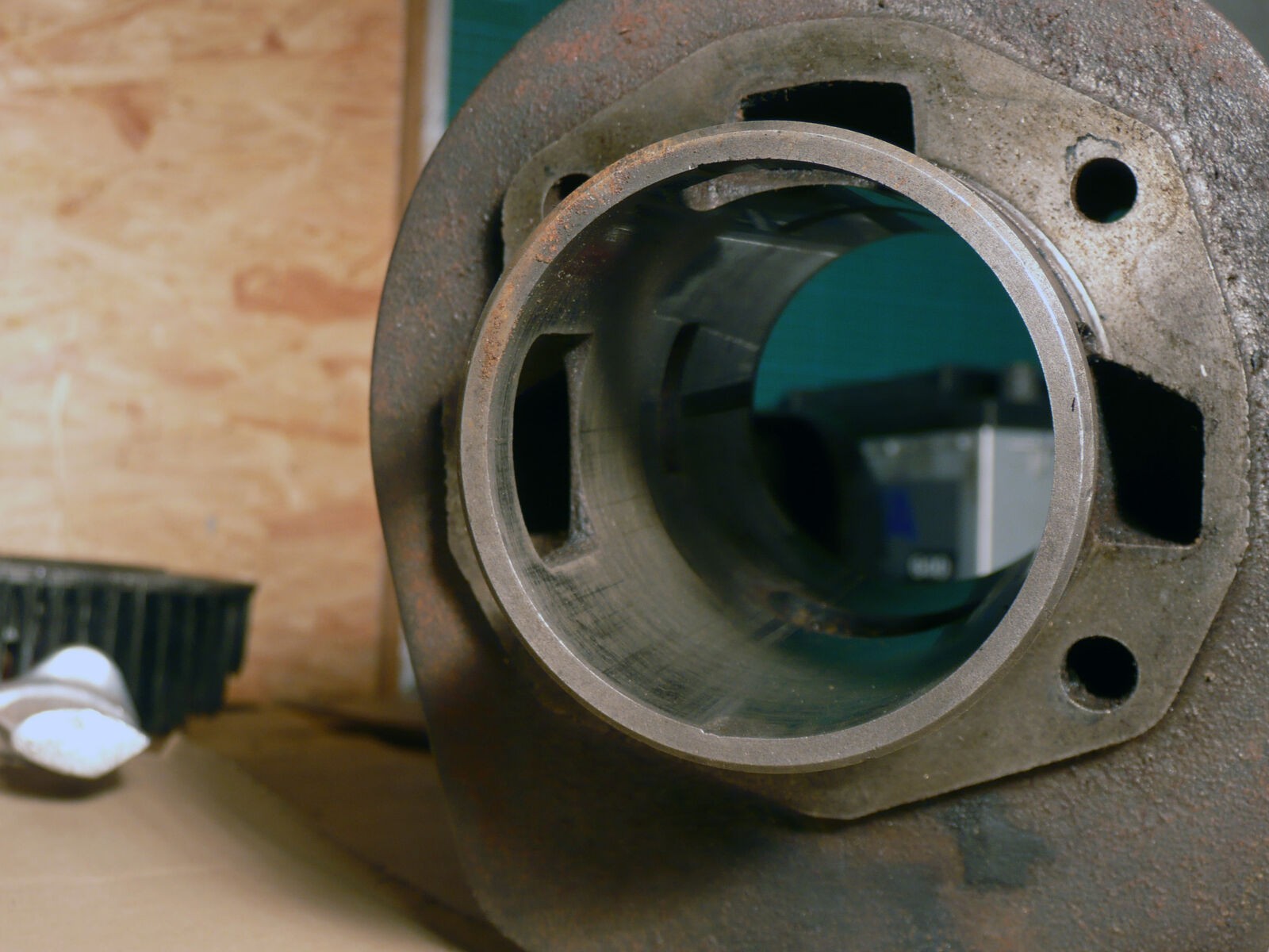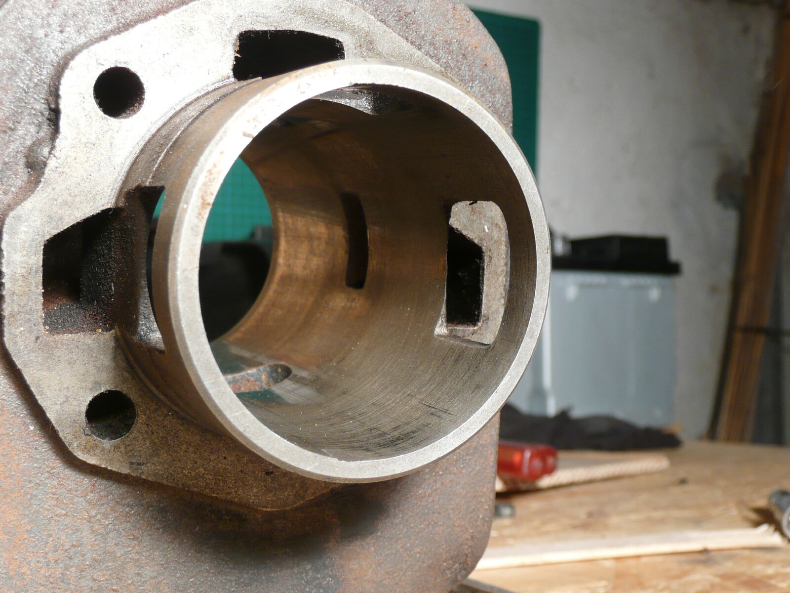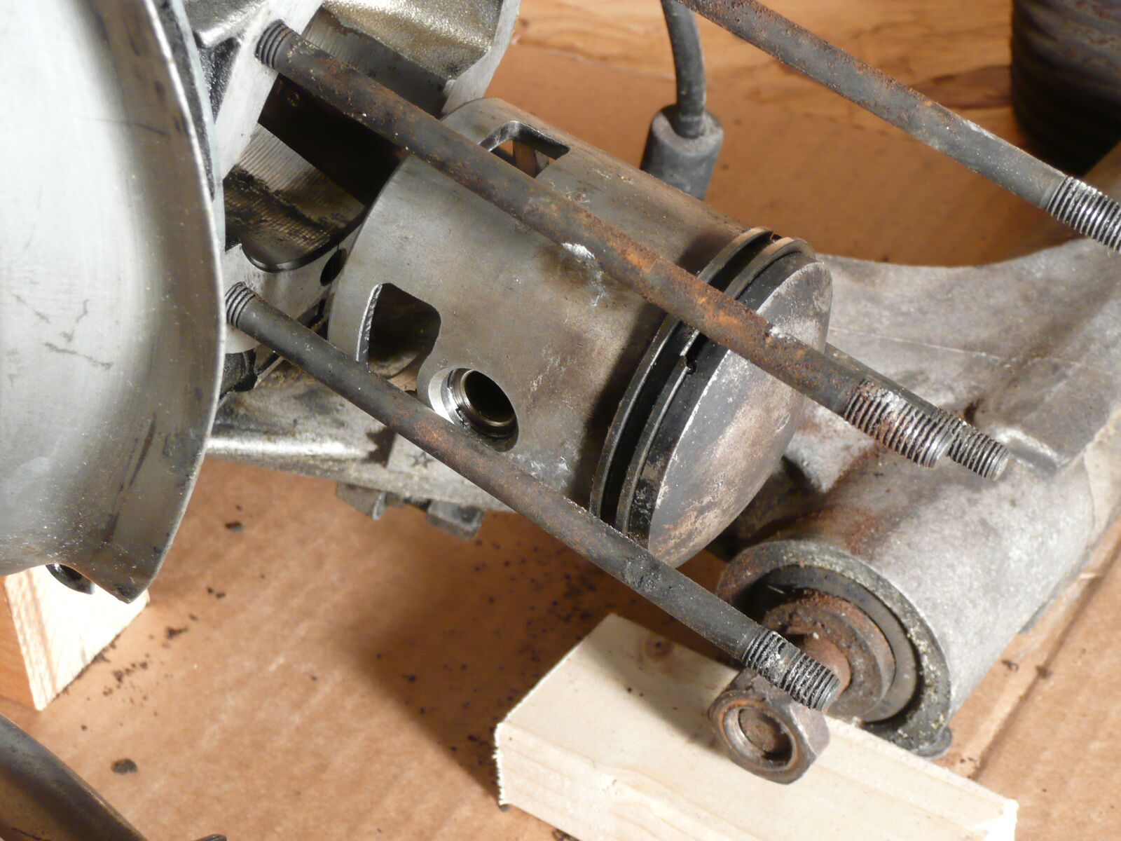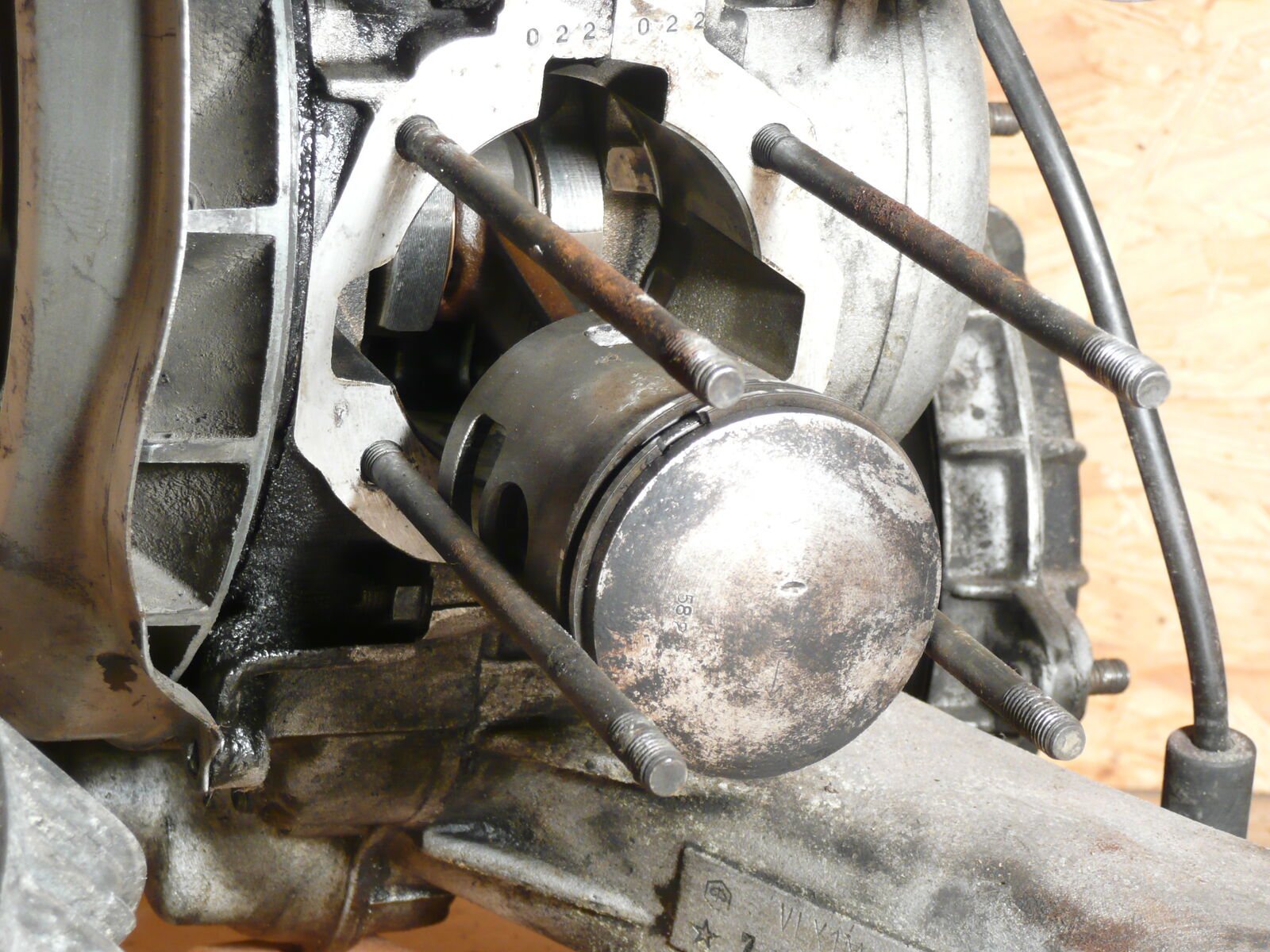 Der Motor sieht gut aus, ohne äussere Beschädigungen, aufgemacht hab ich ihn nicht, er lässt sich aber leicht von Hand drehen. Zylinder und Kolben sind ohne größere Schäden, auf den Fotos kann mans ja immer schlecht sehen, aber beim Fühlen mit dem Finger ist die Zyli Wand glatt und ohne Riefen. Der Kolben ist OK? ich habe oben auf dem Kolben eine kleine Macke gesehen...