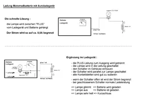 Wenn gerade kein passendes Motorrad-Batterie-Ladegerät vorhanden ist geht´s auch mit einem normalen Autoladegerät. Um den Strom zu begrenzen schaltet man einfach eine 10 W-Birne in Reihe (10W/12V~0,8A). Das funzt prima wegen der physikalischen Eigenschaften der Glühbirnen => "Kaltleiter".