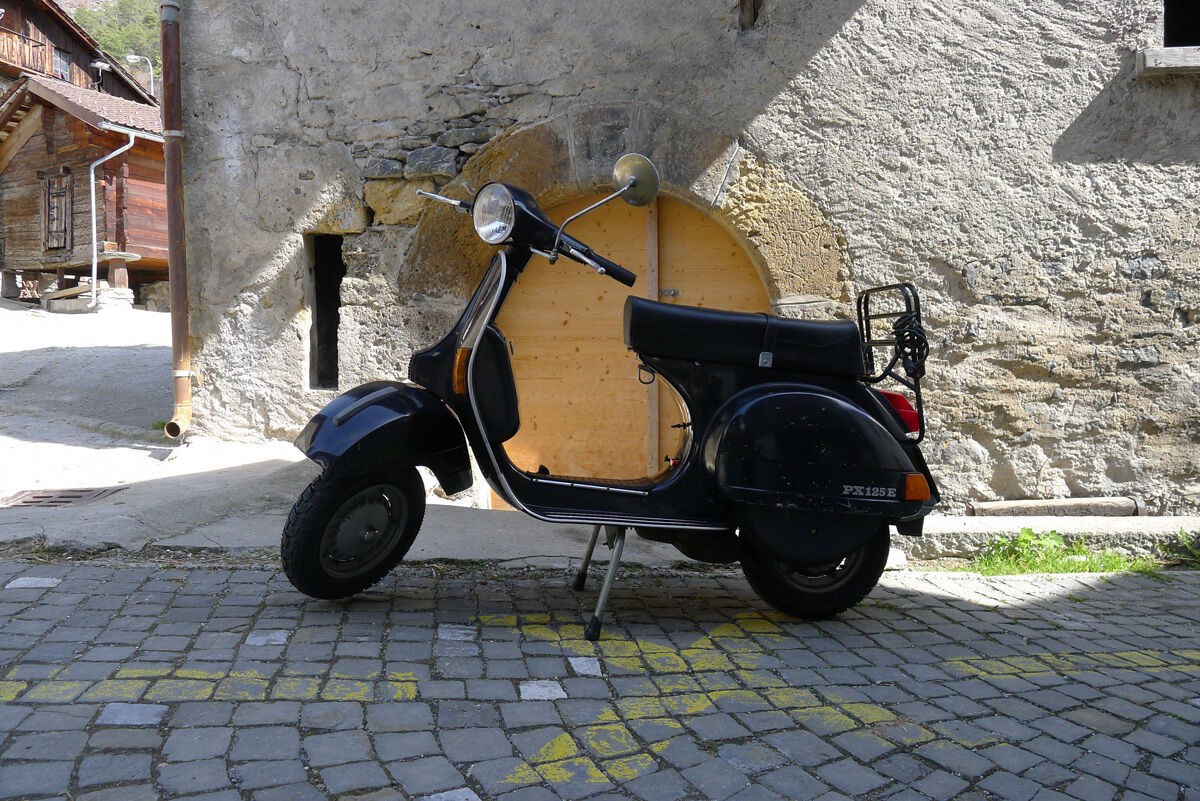 Unglaublich, aber mein Bruder hat ne 32jährige PX 125 E geschenkt gekriegt!! Er kennt sich mit Vespas nicht so aus und ich bin mit ihm das schmucke Teil abholen gegangen. Die Vespa hat nur 5000 Km auf dem Buckel und wurde seit 12 Jahren nicht mehr angerührt. Bereits beim 4ten Kick sprang die PX an und lief ganz flott vor sich hin. Die Vespa hat absolut keinen Rost und ist noch im O-Lack… einfach geil!