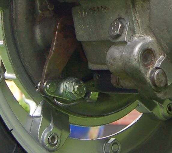 • Zu erst die Einstellschraube ganz rein drehen. Dann das Befestigungsteil am Hebel mit dem Stift befestigen und mit Splint sichern. Danach dann den Seilzug zwischen den beiden Plättchen durch das Loch in der Schraube fädeln. Den Zug spannen und festschrauben. Prüfen ob der Hebelweg am Pedal OK ist, sonnst ggf den Zug weiter durchziehen. Wenn die Bremse anspricht, bevor das Pedal auf dem Bodenbrett liegt, das restliche Kabel nach vorne umbiegen und ib den Haken legen. Dann die Feineinstellung mit der Einstellschraube vornehmen.