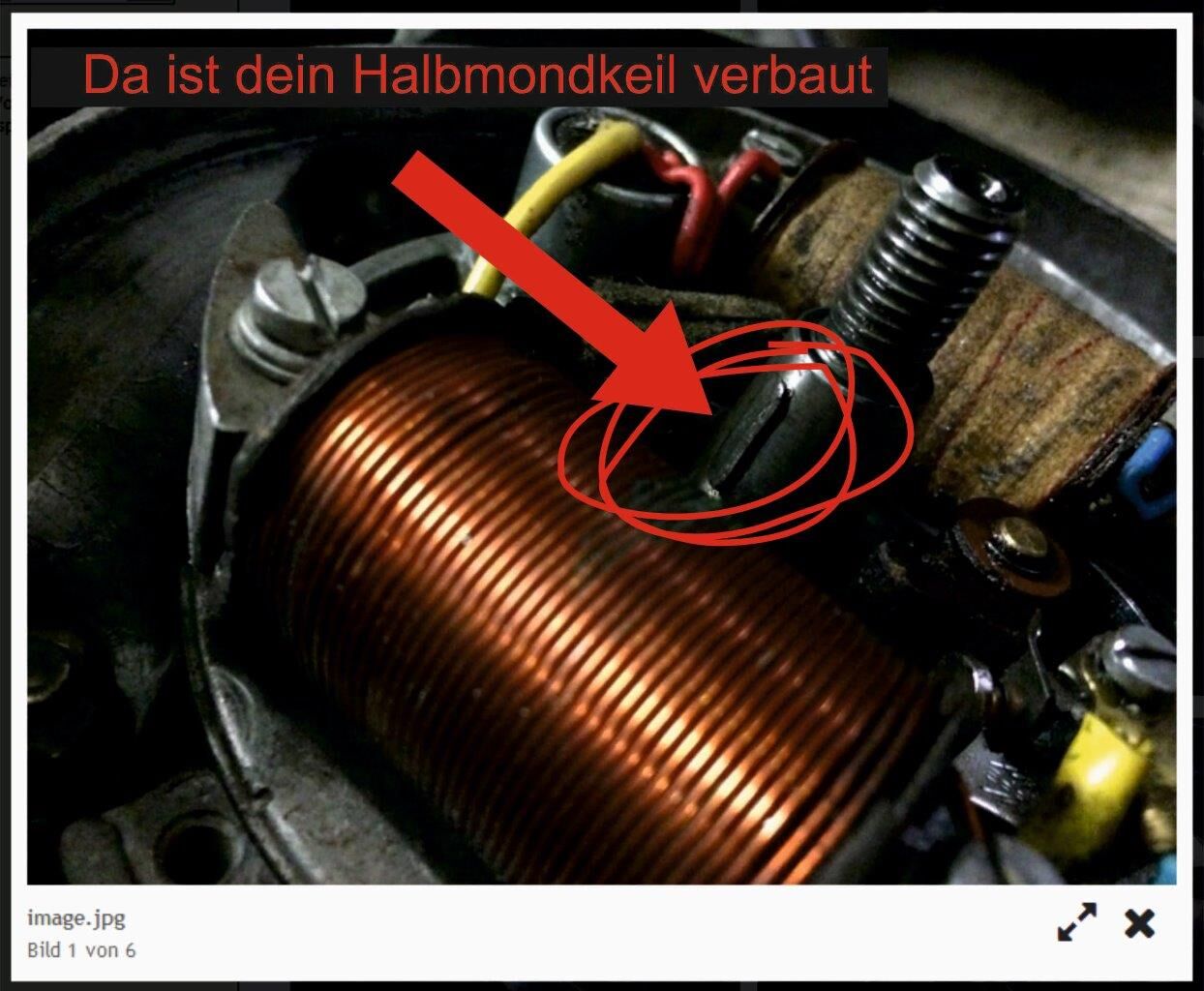 Der Halbmond kam gerade. Leider konnte ich ihn nicht montieren. Im Anhang sind ein paar Bilder. Die Nut im Polrad scheint nicht mehr ganz so gut zu sein. Der Gegenpart an der Welle ist auch irgendwie schief abgeschliffen.