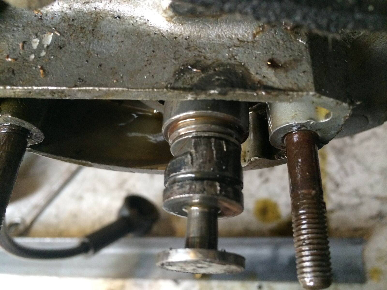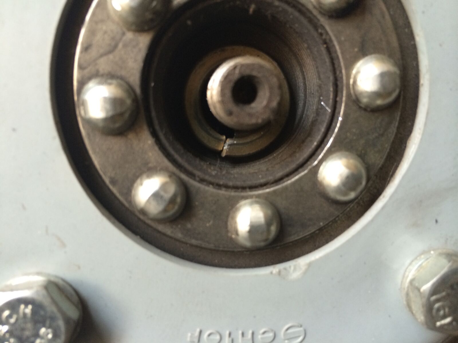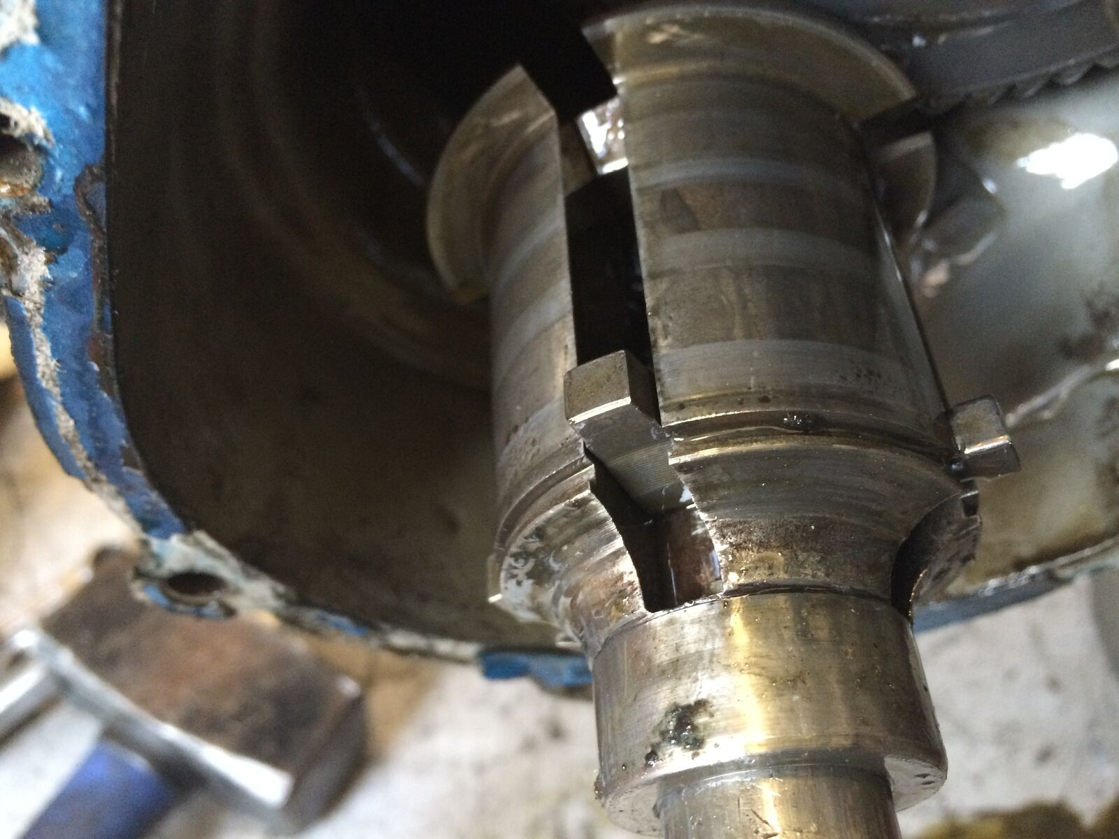 Oldieantriebswelle mit neuem Schaltkreuz, eigentlich in Ordnung...Aber irgendwie sieht die Führung des Schaltklotzes recht verdaddelt aus, die "umgebogene Scheibe zum Sichern von Schaltbolzen und Führung" ist hier nur ne (viel zu dicke) Unterlegscheibe. Die natürlich nicht umgebogen wurde, weil viel zu dick. Die Schaltposition des Kreuzes stimmt also auf keinen Fall.