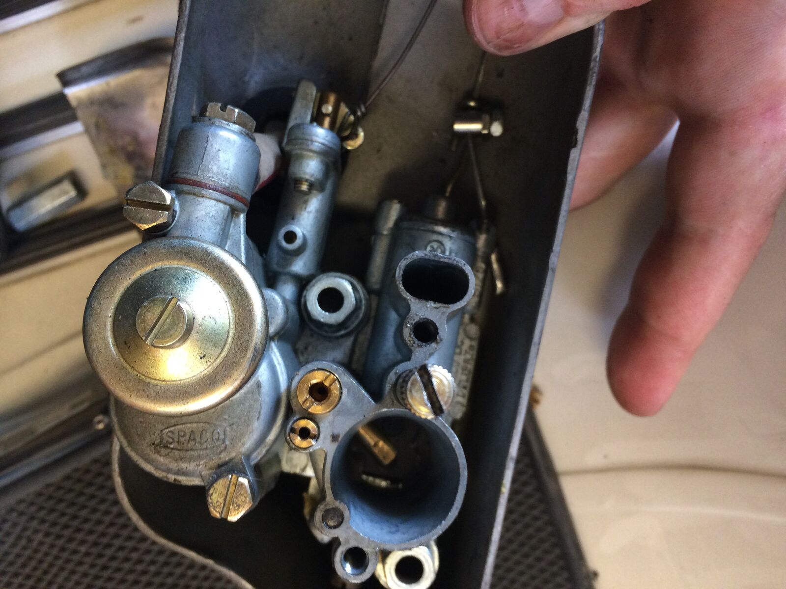 Einige von uns mögen einen gewissen Fetisch haben, was Asiatinnen und ihre speziellen Reize angeht. Heute hatte ich das zweifelhafte Vergnügen, mich einer Dame anzunehmen, die irgendwann zwischen 1960 und 1962 als 150er auf 8 Zoll das Werk in Italien verlassen hat, schließlich in Asien geendet ist. Eine VBB als Reimport aus... sonstwo. Natürlich ist ein schöner neuer blingbling Lack, auf dem kein Magnet hält dabei, sowie ein nagelneuer Asiamülltacho und die berühmten 10 Zoll Qualitätsumbaubremsen, die ganz speziell an die Bedürfnisse des Kotflügels angepasst wurden. Nicht. Zum Glück.