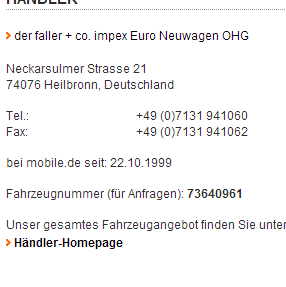 Wenn ich in Mobile Schaue finde ich immer den Händler der faller + co. impex Euro Neuwagen OHG