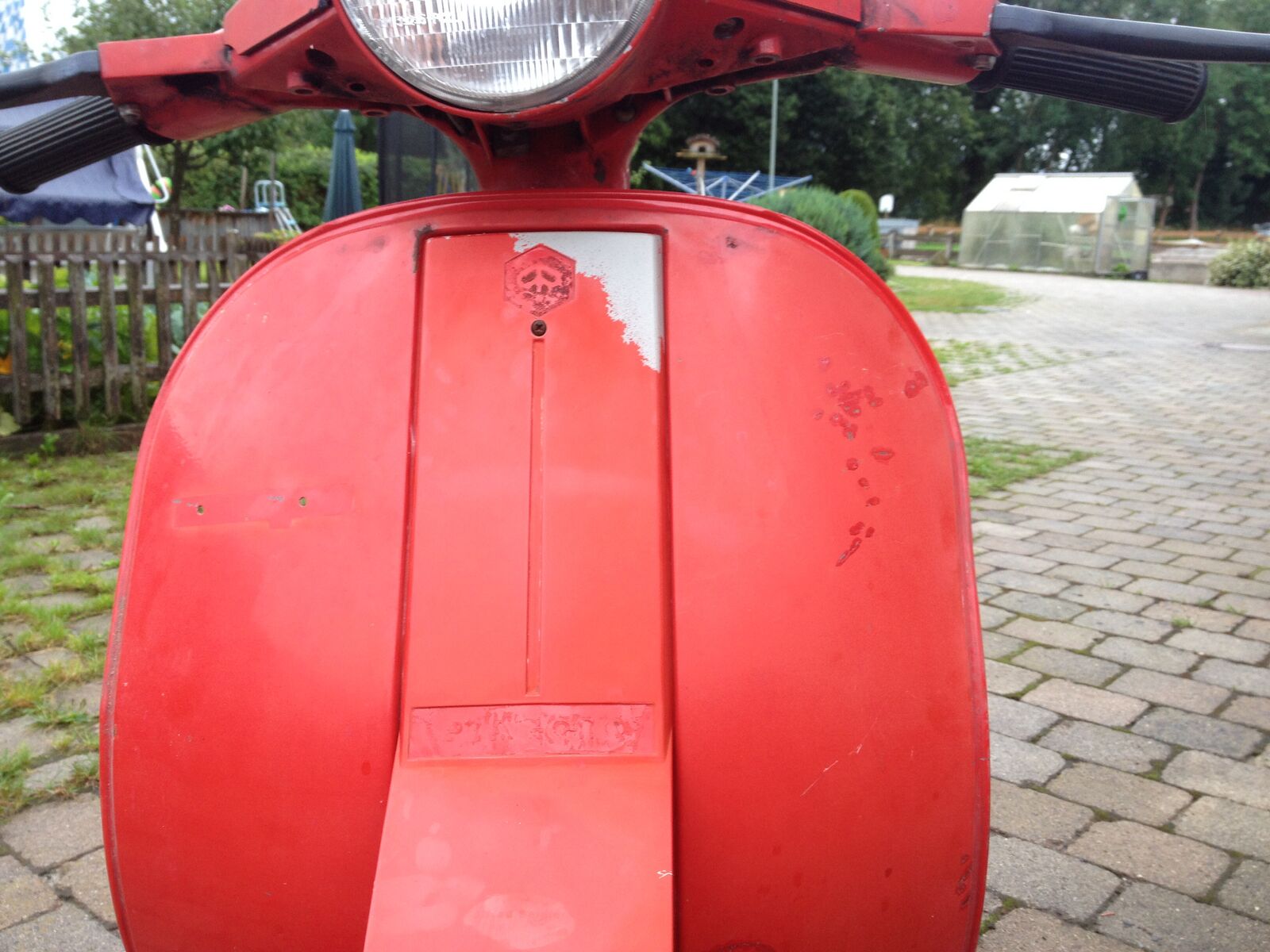 Meine Vespa ist eine PK50 Bj. 83 ohne Blinker ect. Motor läuft gut und springt sofort an. Der Lack ist leider ziemlich ausgebleicht und Kratzer wurden mit Lackstift überpinselt. Der Kotflügel hat zwei Dellen aber sonst ist sie komplett und weitgehend Rost frei (bis auf etwas Flugrost an den Kratzern).