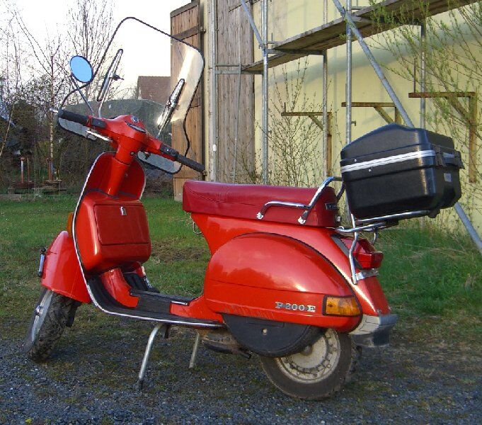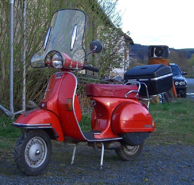 Sie ist eine Vespa Piaggio P200E VSX1T, Bj 05/1982 in orangerot, stylischem Windschild, roter Sitzbank und originalem Vespa-Koffer ![]()