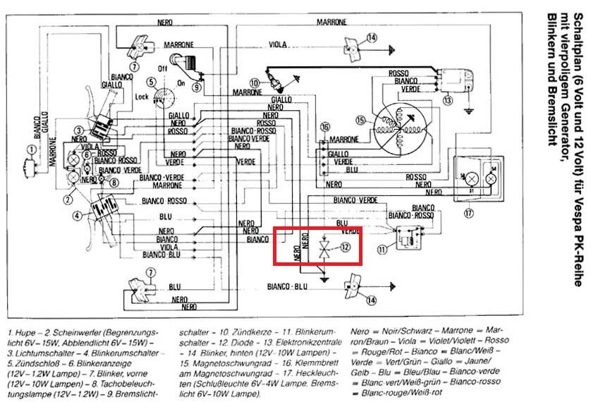Wenn ich die Diode abklemme funktionieren die Blinker. Aber die Lichter brennen durch. Wenn ich sie anschließe funktioniert gar nichts. Da ich die Vespa restauriert erworben habe denke ich fast, dass da was falsch angeschlossen ist. (Diode sieht aus wie neu)
