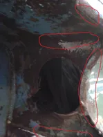 Motor wurde wieder ausgebaut und Schaden am Kicker begutachtet. Leder habe ich nicht auf die schlechte Verzahnung an. Kickstarter Segment und 1. Gangrad geachtet. Vermutlich wurde das Fahrzeug desshalb aus dem Ostblock in den Westen verkauft. Diese beiden Teile waren nur noch Schrott und mehr Hügel als scharfkantige Verzahnungen. Da konnten die Federn auch nichts mehr andrücken....Bei der Demontage viel mit auf, dass sich das Rahmenblech in der Mitte (wo sich das Loch ür den Vergaser befindet) vom Rest des Chassis gelöst hatte. Das hing nur noch an 2 statt 4 Seiten am Rahmen. Richtig erschrocken bin ich dann, als ich mit einer Zange dieses Blech mit dem Rahmenblech zum verschweißen zusammen drücken wollte. Das zusammendrücken des 3 mm Spaltes löste am Ende des Vjatka Rahmens einen Bewegung von ca 1 cm aus !!!