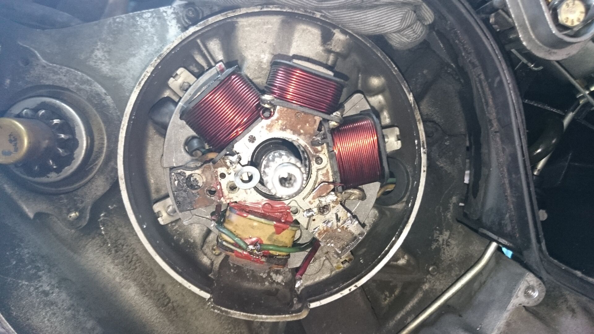 Und wieder ist es auf der ZGP zu heiß geworden. Die untere Spule ist schwarz. Schluss nach Masse. Sicherung knallt sofort bei angeschlossener Batterie, auch ohne Zündung. Pickup gebraten.