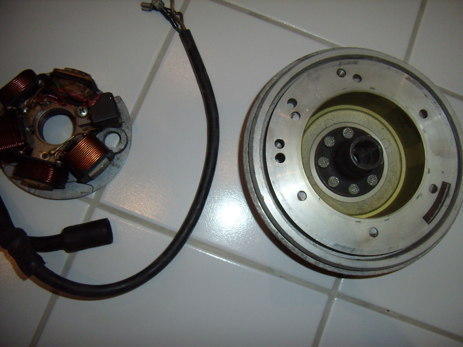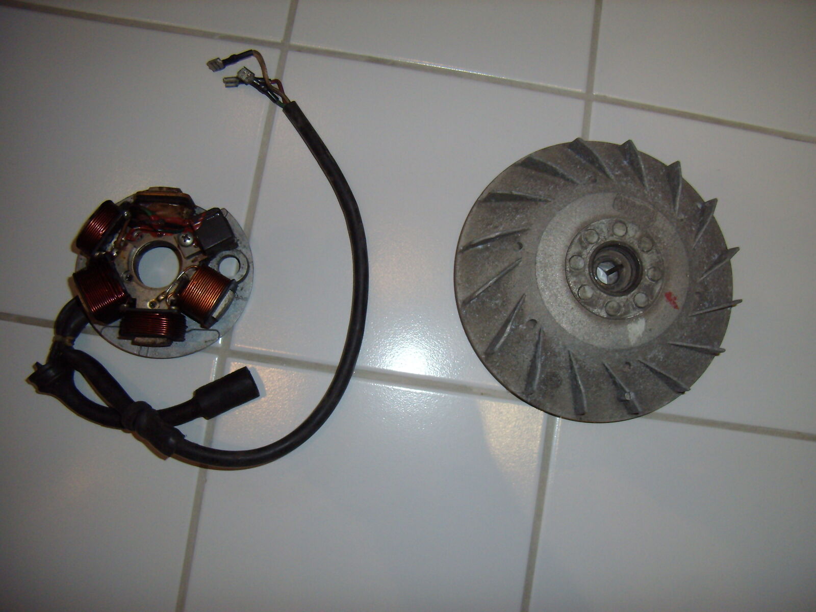 Original Piaggio PK Zündung, großer Konus, Aufschrift Lüfterrad: PKM/8A 992176, alle Schaufeln dran, Magnete sind unbeschädigt, Nut - Konus - Gewinde sehr gut, Funktion der ZGP nicht geprüft optisch aber tadellos, wird nur zusammen verkauft
