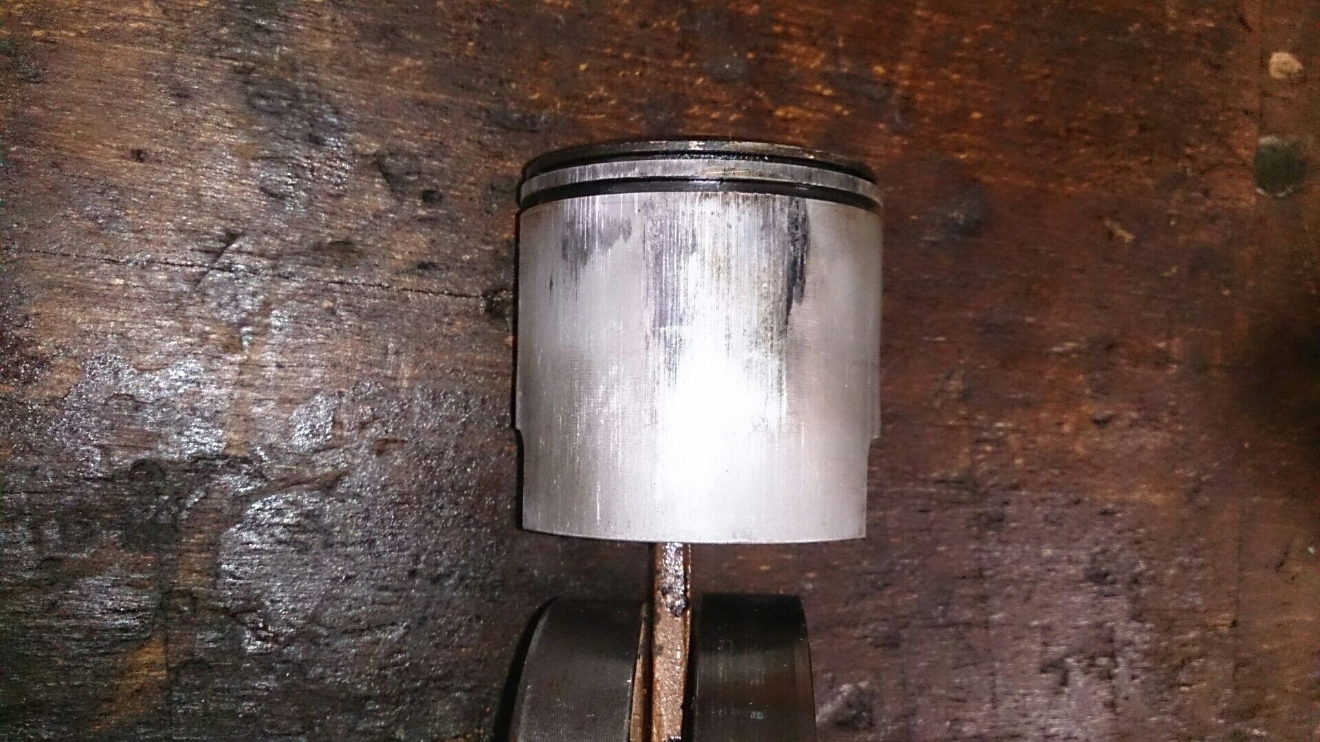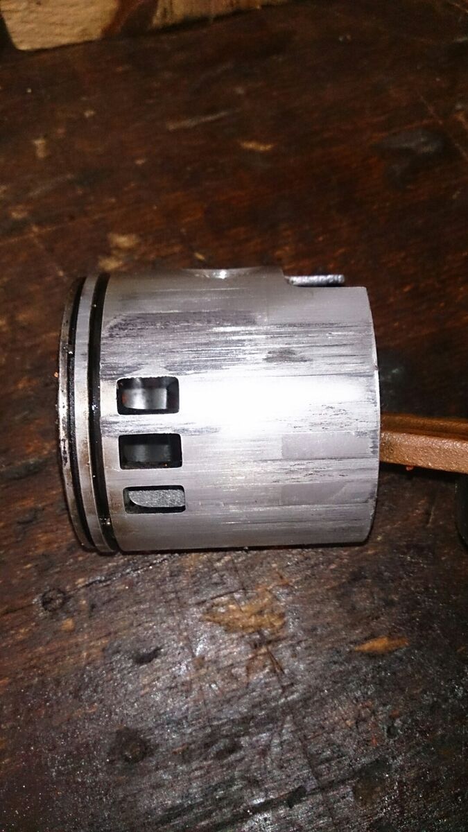daraufhin habe ich den motor zerlegt und mir fiehll beim abziehen des zylinders der starke graufarbene öleintrag des getriebeöls auf. auch die fressspuren am kolben sind nicht zu übersehen.