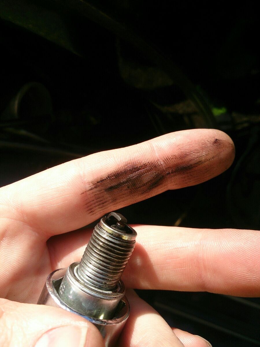 alles war wie gesagt mit dem blaurauchen verbunden. die zündkerze war nach dem ziehen schwarz, nass und mit öl bedeckt.