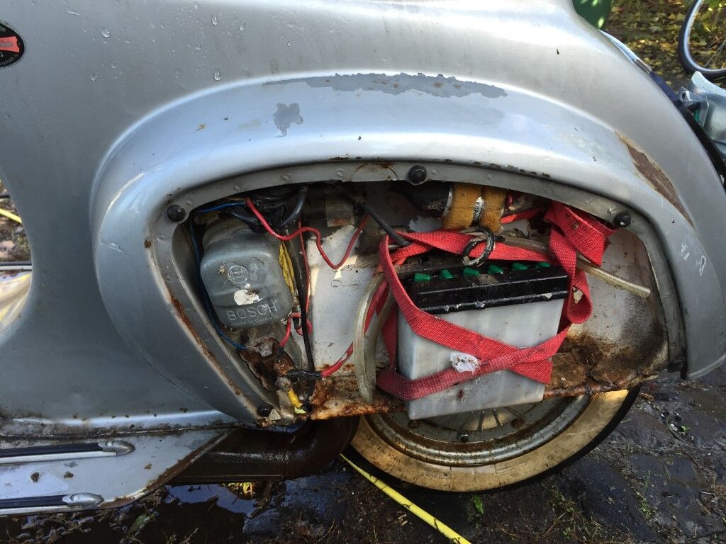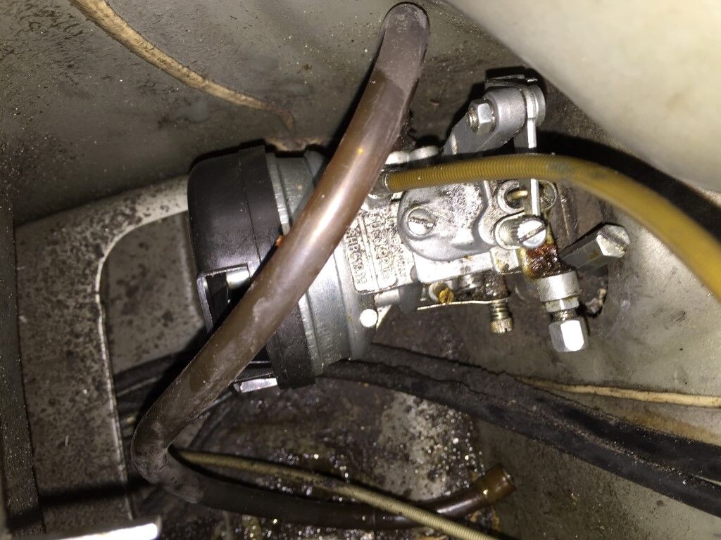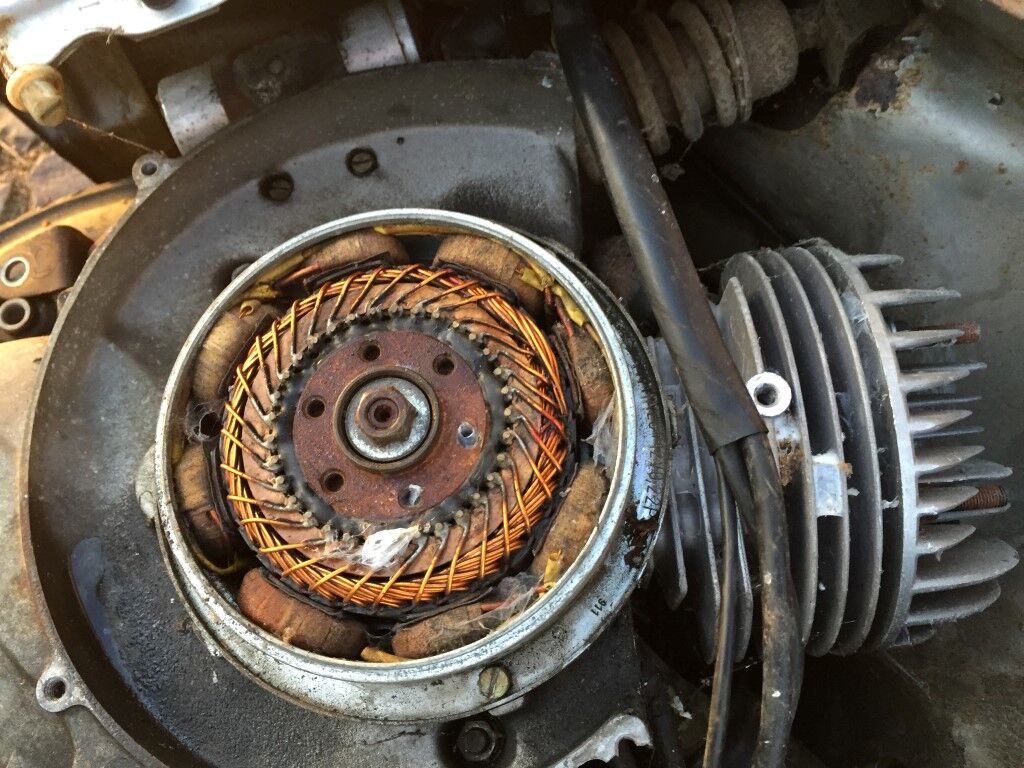 Die Vespa ist Motor/Vergasermäßig in einem sehr verbastelten Zustand. In den drei Jahren die ich die Vespa als Jugendlicher gefahren bin, wurde zunächst ein 50ccm Rennkit von Pollini und später ein 75ccm verbaut. Dabei wurde auch der Vergaser und Auspuff auf Modelle von Pollini gewechselt. Zulassung hatte das keine, aber das war mir damals auch herzlich egal. Nachdem sich der 75er Kolben stecken geblieben ist, habe ich nochmals aufgerüstet und einen 102ccm Satz (ebenfalls von Pollini) installiert. Nach der Installation musste ich jedoch feststellen, dass der Roller nicht mehr anspringen wollte. Was alles beschädigt ist, habe ich damals nicht mehr untersucht, da ich zwischenzeitlich auch meinen Motorradführerschein gemacht hatte und alle Investionen in das große Zweirad geflossen sind.