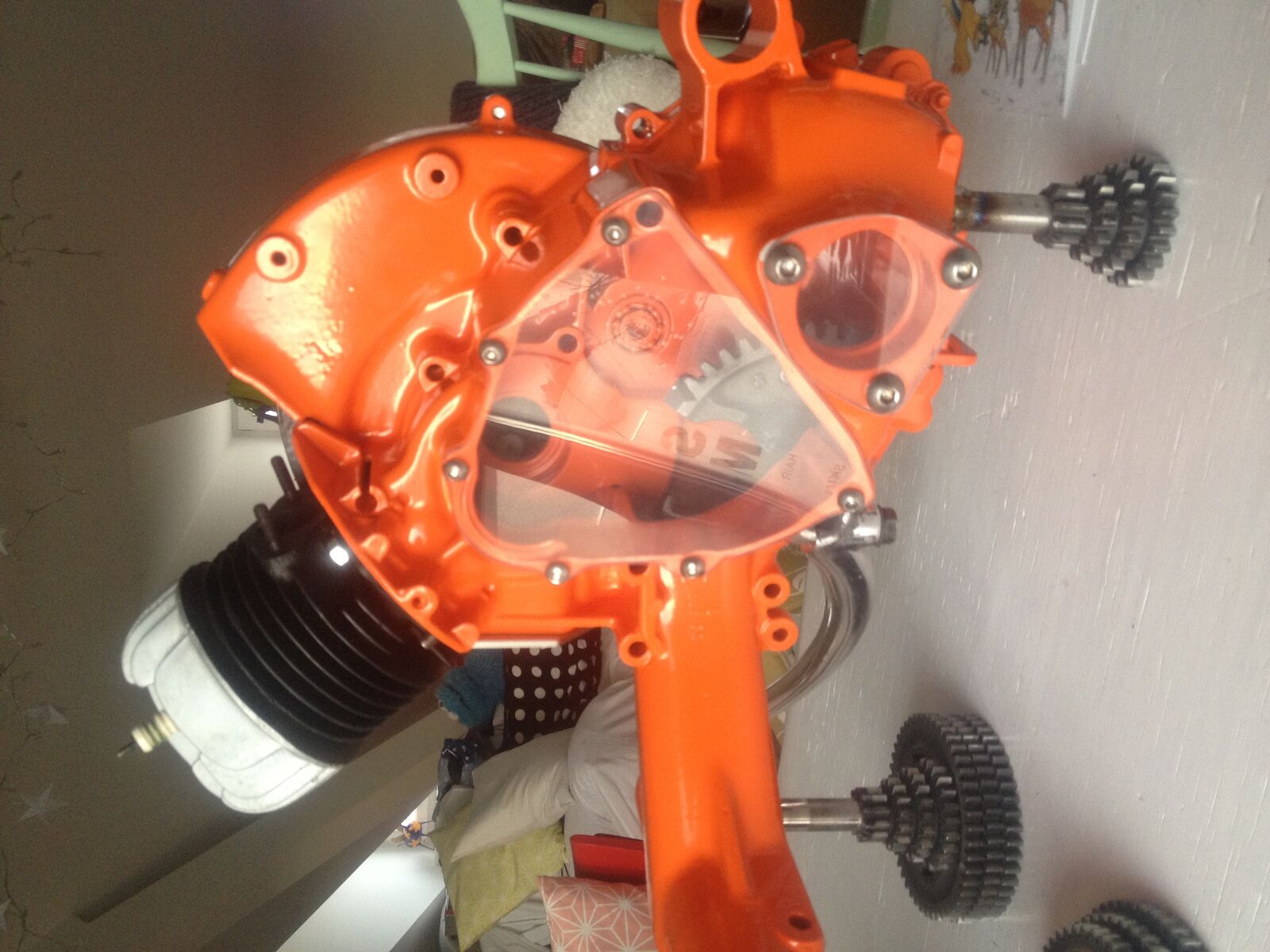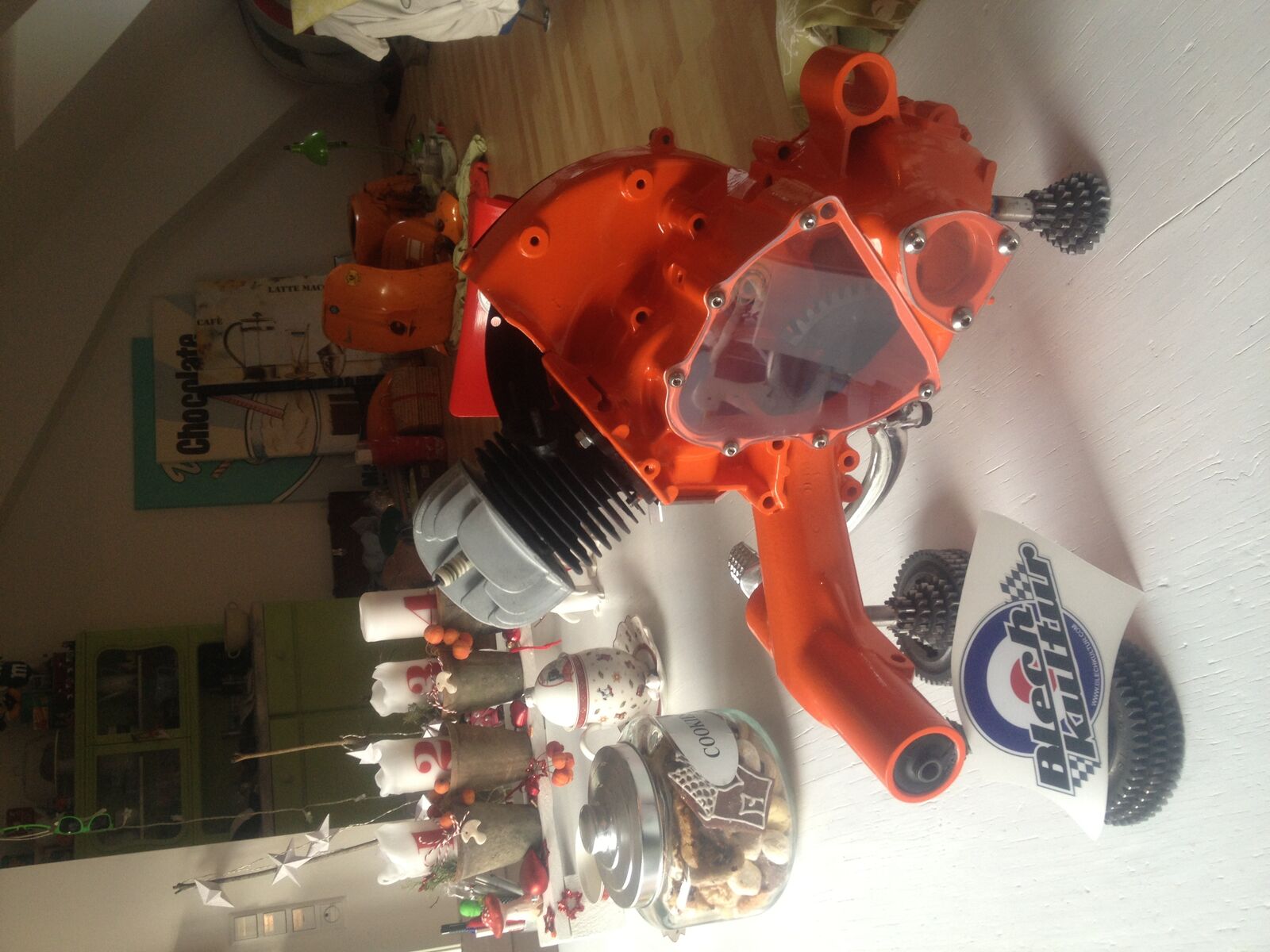 ein gepulverter Motorblock mit hübsch angepassteren plexischeiben, abnehmbarem Zylinderkopf (da kann man das Geld einschmeißen) und zu einer Uhr umgebauten lüraabdeckung (zum direkt montieren, Schrauben waren direkt dabei