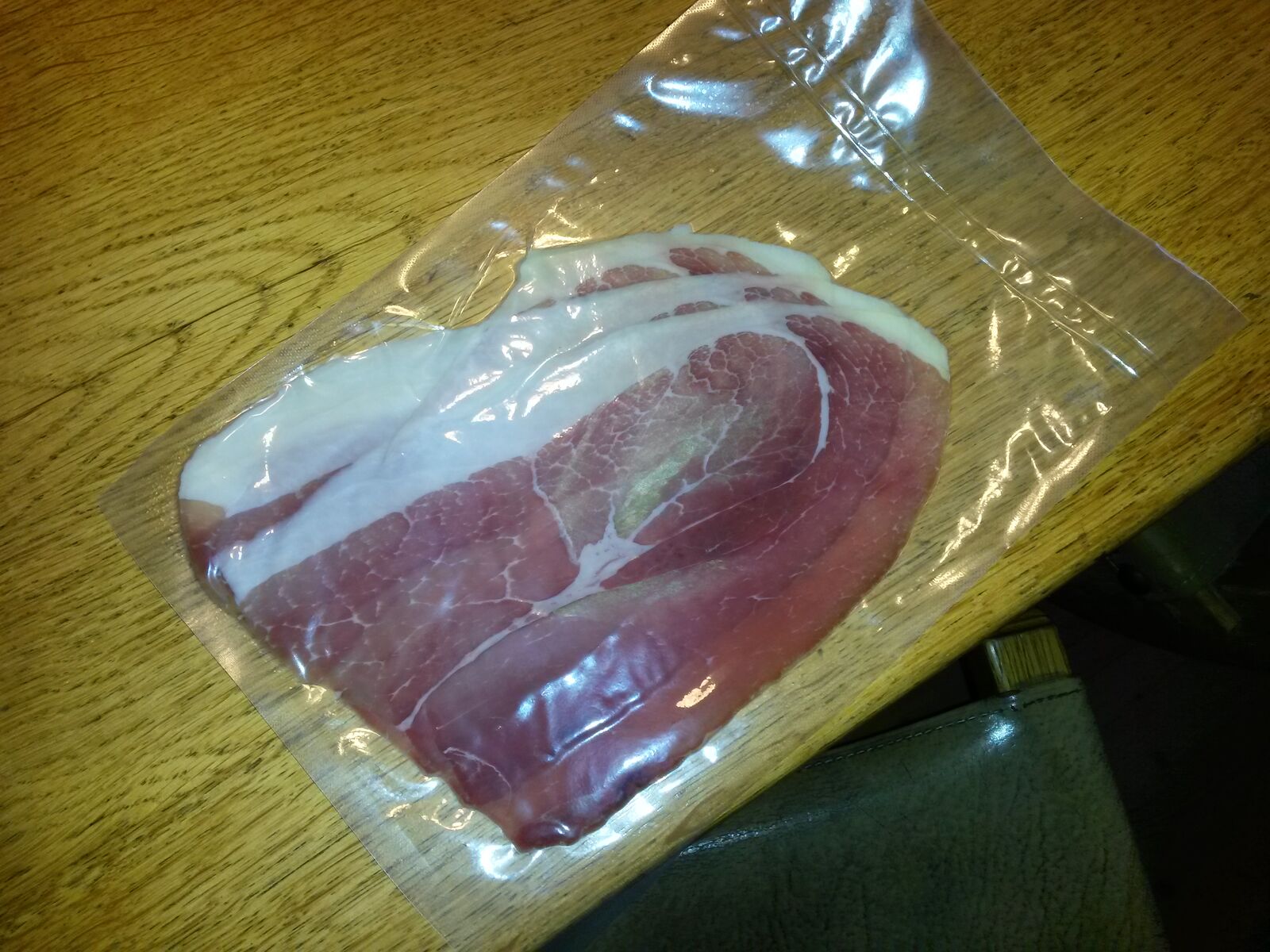desweiteren 3 scheiben rohen schinken... was mich etwas irritiert hat... aber warum nicht!hmm also ich als fischkopp würd mal sagen, das n typisches hamburger care paket, denke mal nicht das der schinken roh ist, sondern der sieht eher wie holsteiner katenschinken aus, ne spezialität hier im norden.