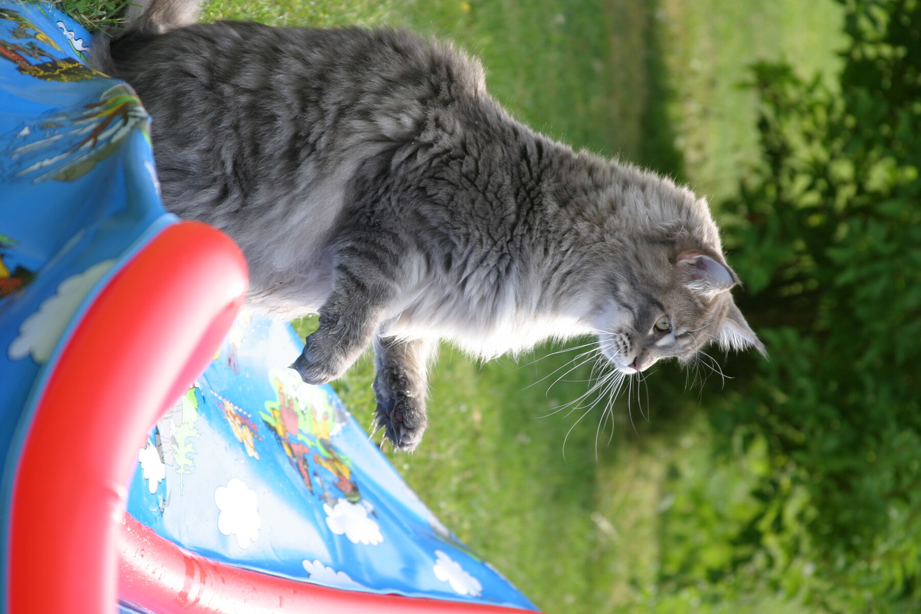 holsteiner katzen. sie (braun) 7,5 kg, ihr bruder (grau) hat 9,5 kg und kommt auf den hinterbeinen stehend locker mit den vorderpfoten auf die arbeitsfläche in der küche):keine ahnung warum er nicht hochkant ist. beide lieben sehr zu unserem leidwesen wasser. im sommer liegen sie entweder im bach oder ruinieren den "swimmingpool".