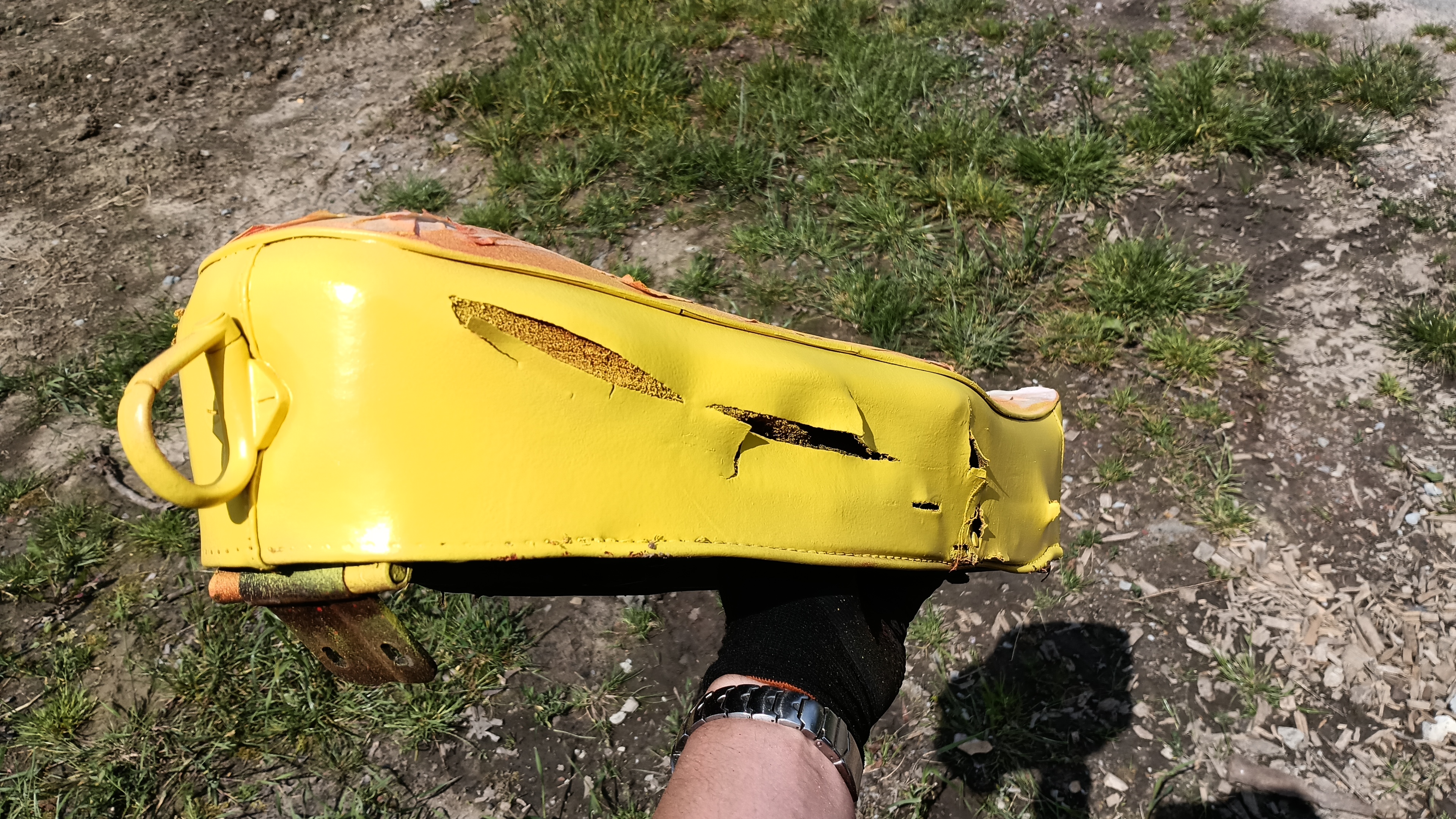 Die originale Sitzbank von der Kirmesbude habe ich ja schon mal den Tarnanstrich verpasst. Heute wurde der angeschliffen,abgeklebt und dann erst Rot,Gelb, Mint lackiert. Hängt jetzt inner Sonne und trocknet. Wenn's durchgetrocknet ist darf der Exenterschleifer drüber rutschen... Wahrscheinlich mit P80 Schleifpapier. Muss ja gut aussehen.