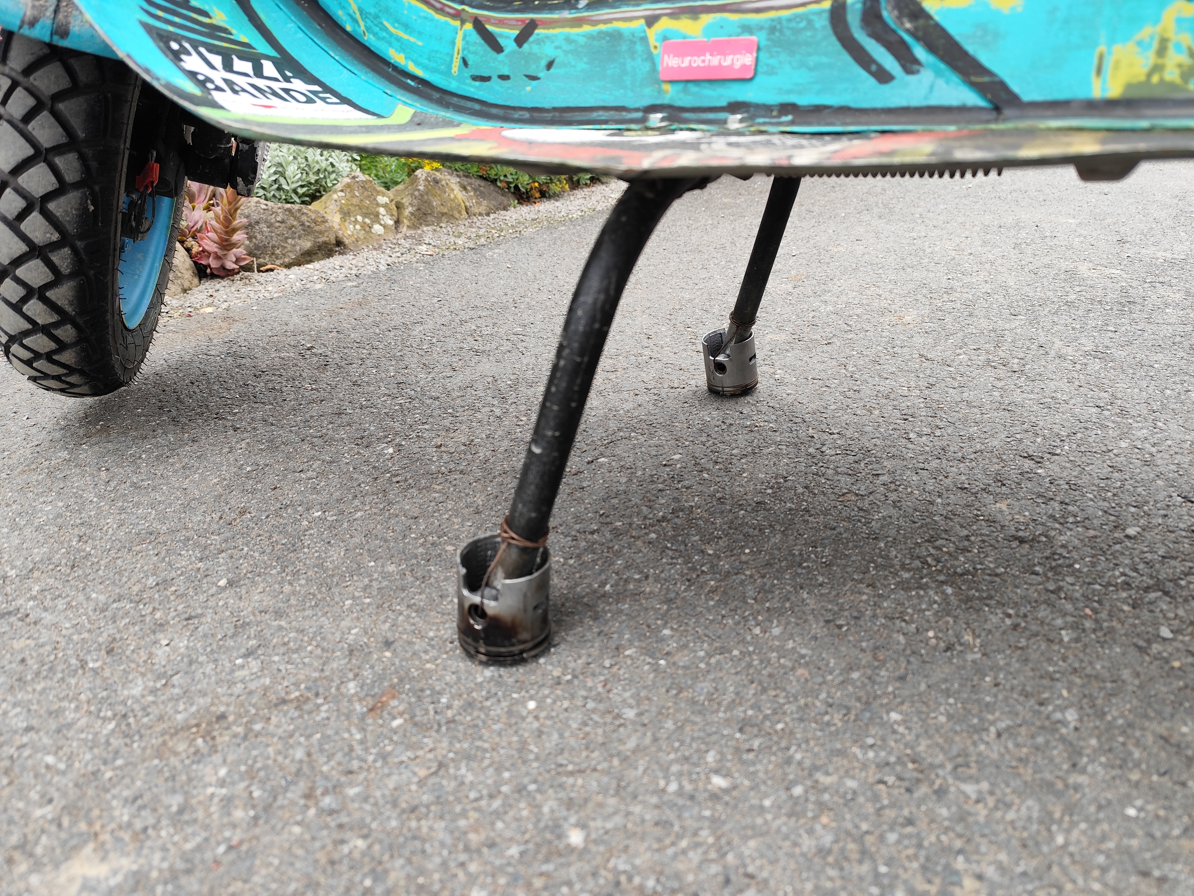 Die steht mit beiden Reifen auf der Erde. Der Ständer ist schon gut verschlissen