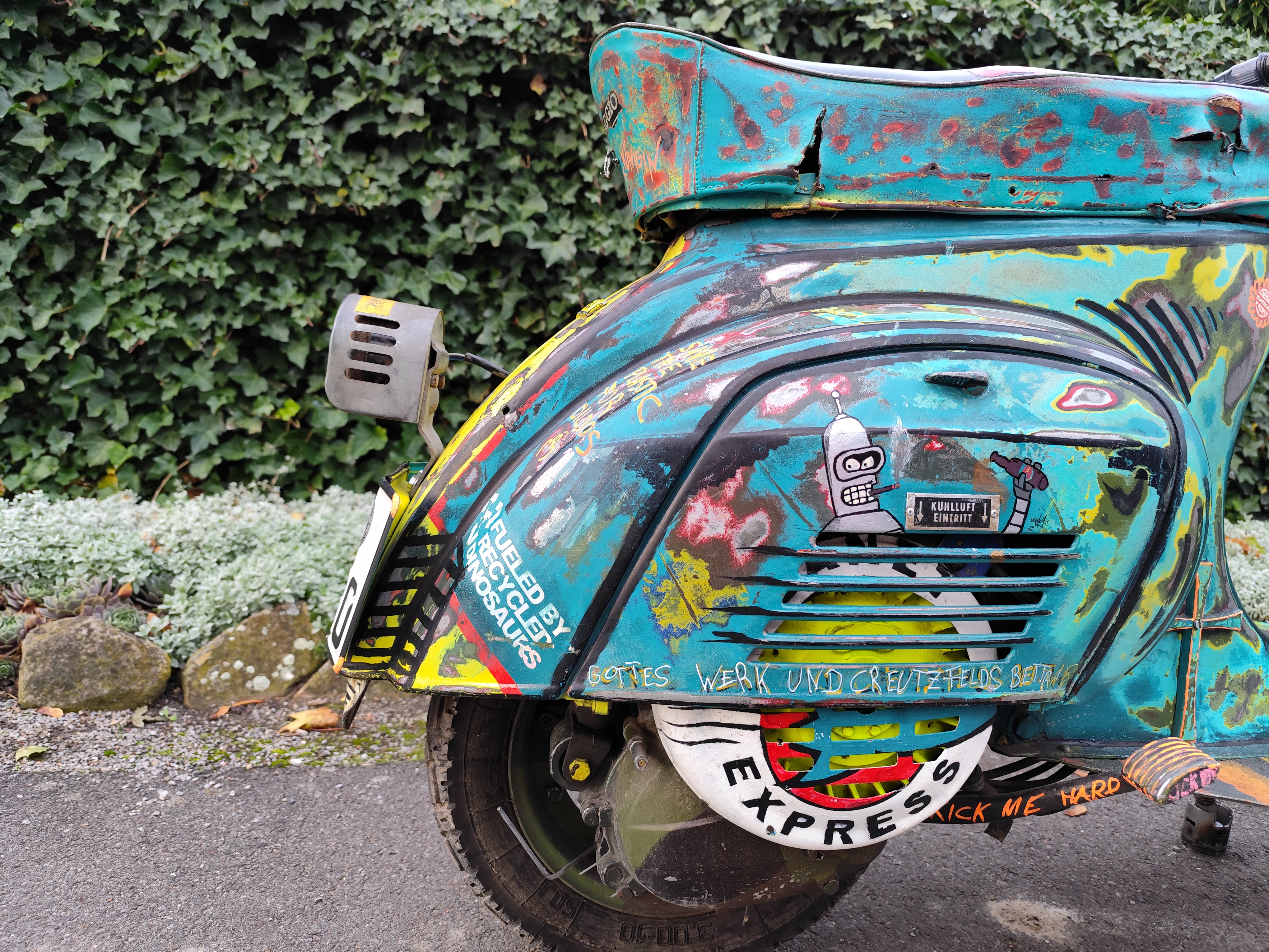 Ich habe von vespaccio u.a ein altes ranziges Repro Rücklicht bekommen. War am überlegen wie ich das optisch herrichten für die Kirmesbude. Als ich die Tage auf nen Dach hockte kam die Erleuchtung. Wollte es erst einseitig farblich anpassen und die andere Seite mit Blattgold überziehen. Jetzt habe ich was besseres gefunden. Dachdeckerblei...