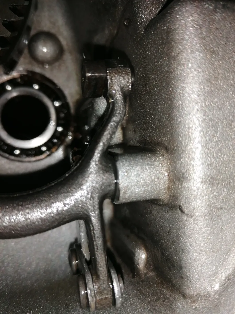Das sich der Trümmer ja nur mit 2 Händen schalten ließ und die Einstellungen der Züge nicht wirklich was brachte habe ich den Motor heute wieder gespalten. Ich hatte ja so ein wenig die Hoffnung gehabt das ich Horst die kleine Wellscheibe unter der Schaltgabel vergessen habe und es deswegen klemmt beim Schalten. Die Scheibe ist drunter...