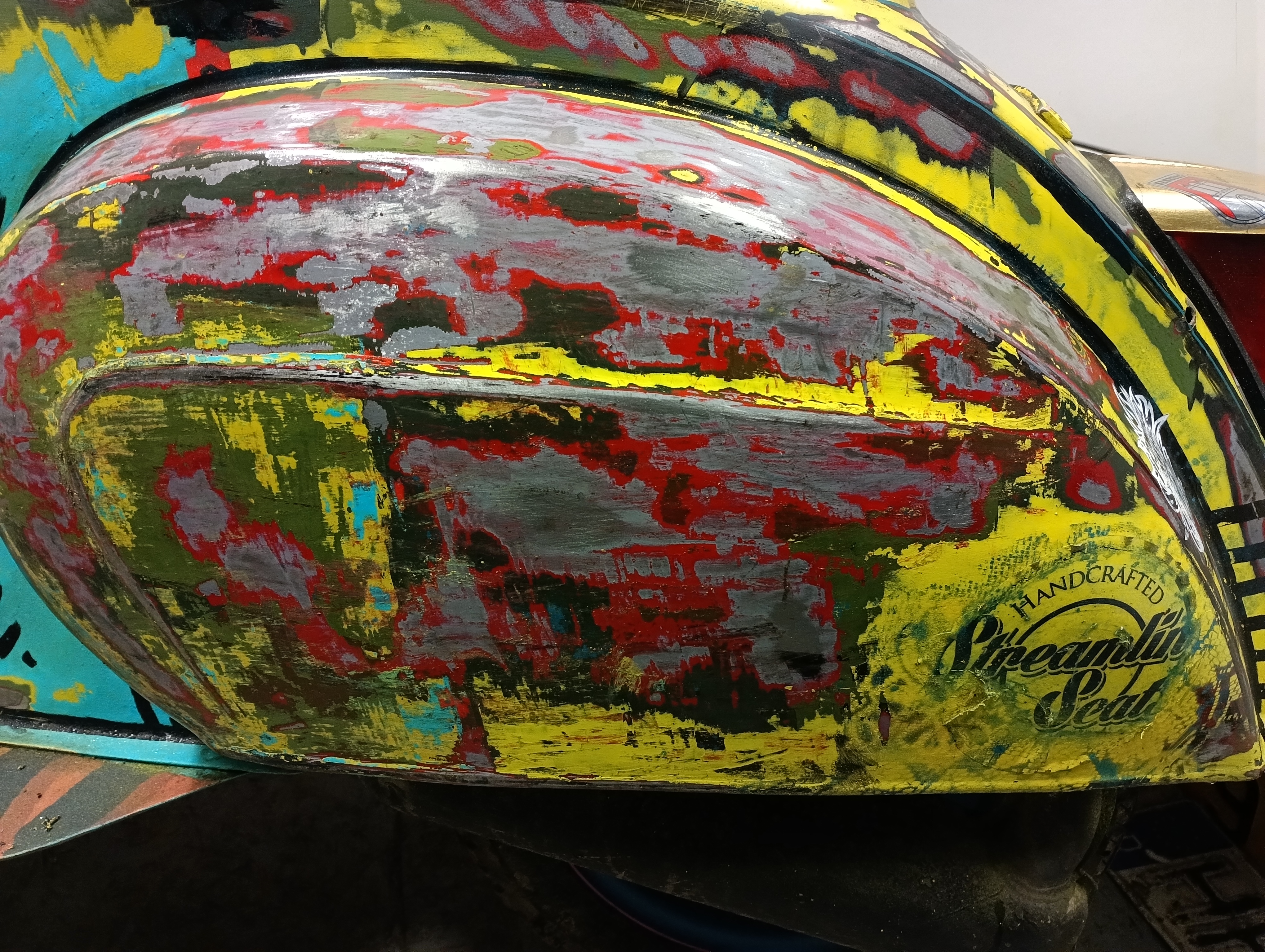 Unter den Rot ist eigentlich noch Orange zu finden. Am Tunnel und Lenker/Kotflügel ist auf jeden Fall noch was. Seite war ich mir nicht sicher. Wurde aber wohl alles weggeschliffen.