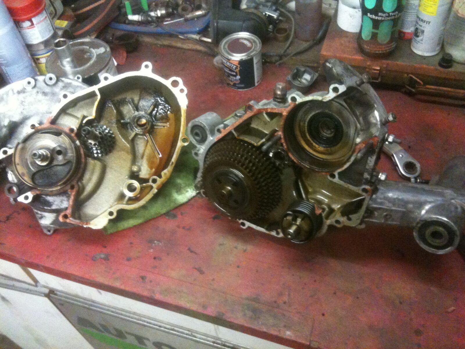 mein Motor sah auch so ähnlich aus. Ich habe den mit dem Rest aus meinem Tank 2T gemisch und einer Wurzelbürste gescheuert, damit ging es ganz gut runter. Manche ganz hartnäckige flecken musste ich dann doch mt der Messingbürste beseitigen. Du kommst aber besser dran je weiter du den Motor zerlegst.