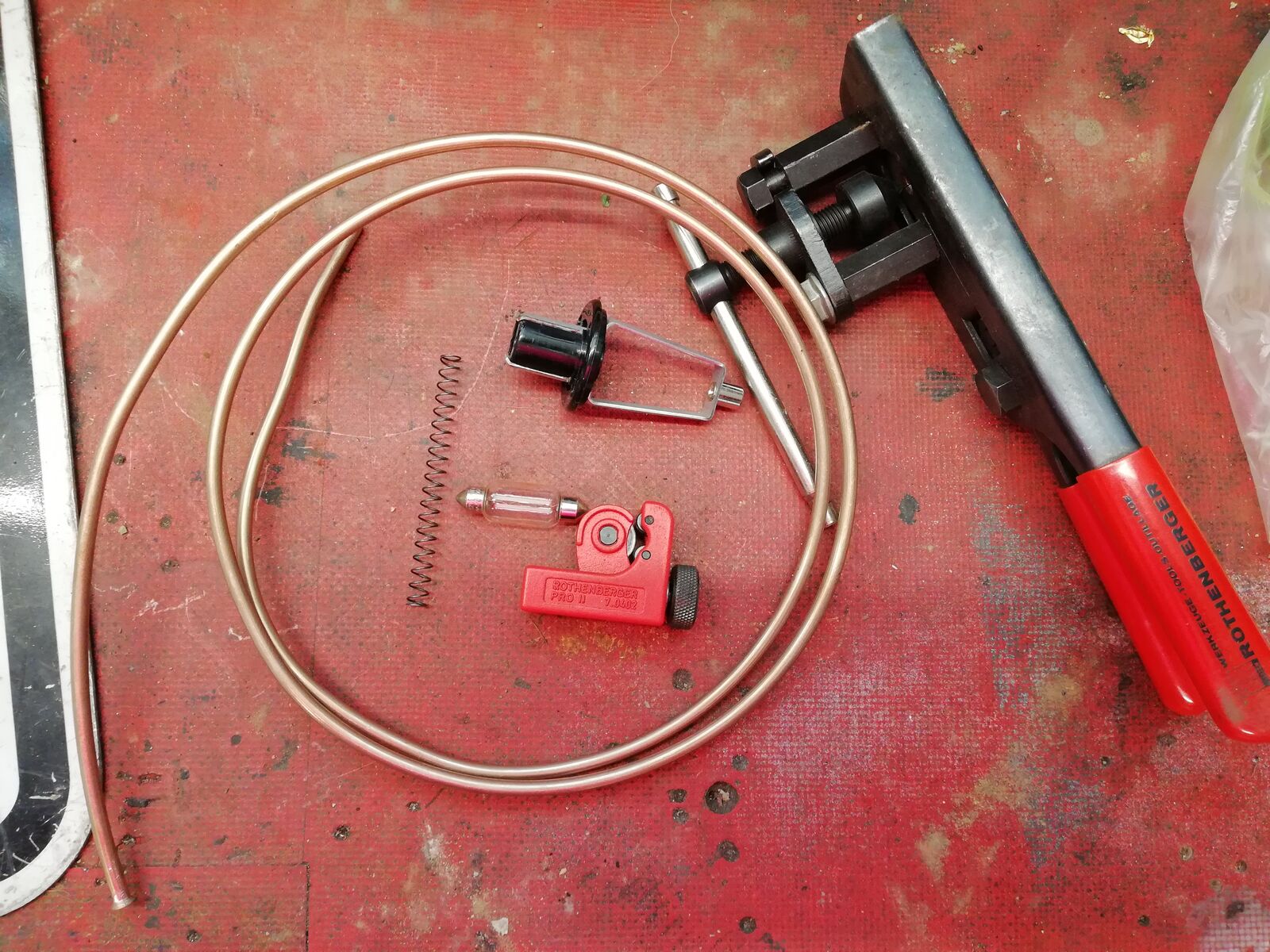 Man nehme Bremsleitung, Bördelzange, Rohrschneider, Sofitte, Feder und die Lenkerendenblinker.