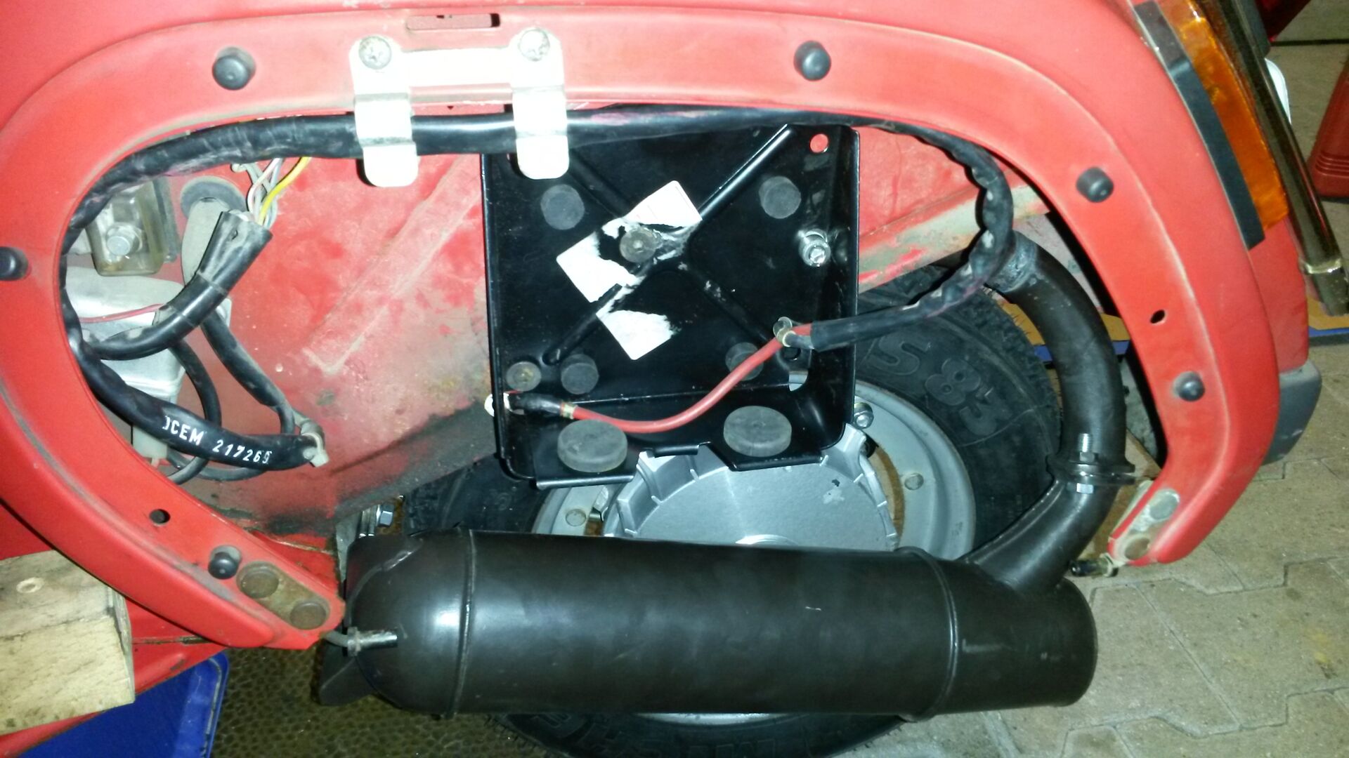 So, habe noch einen Batteriekasten von der PX 80 bestellt und die vorhandenen Löcher vom Rahmen auf den Batteriekasten übertagen. Auspuff passt nun echt gut nachdem ich diesen nochmals leicht verändert habe.