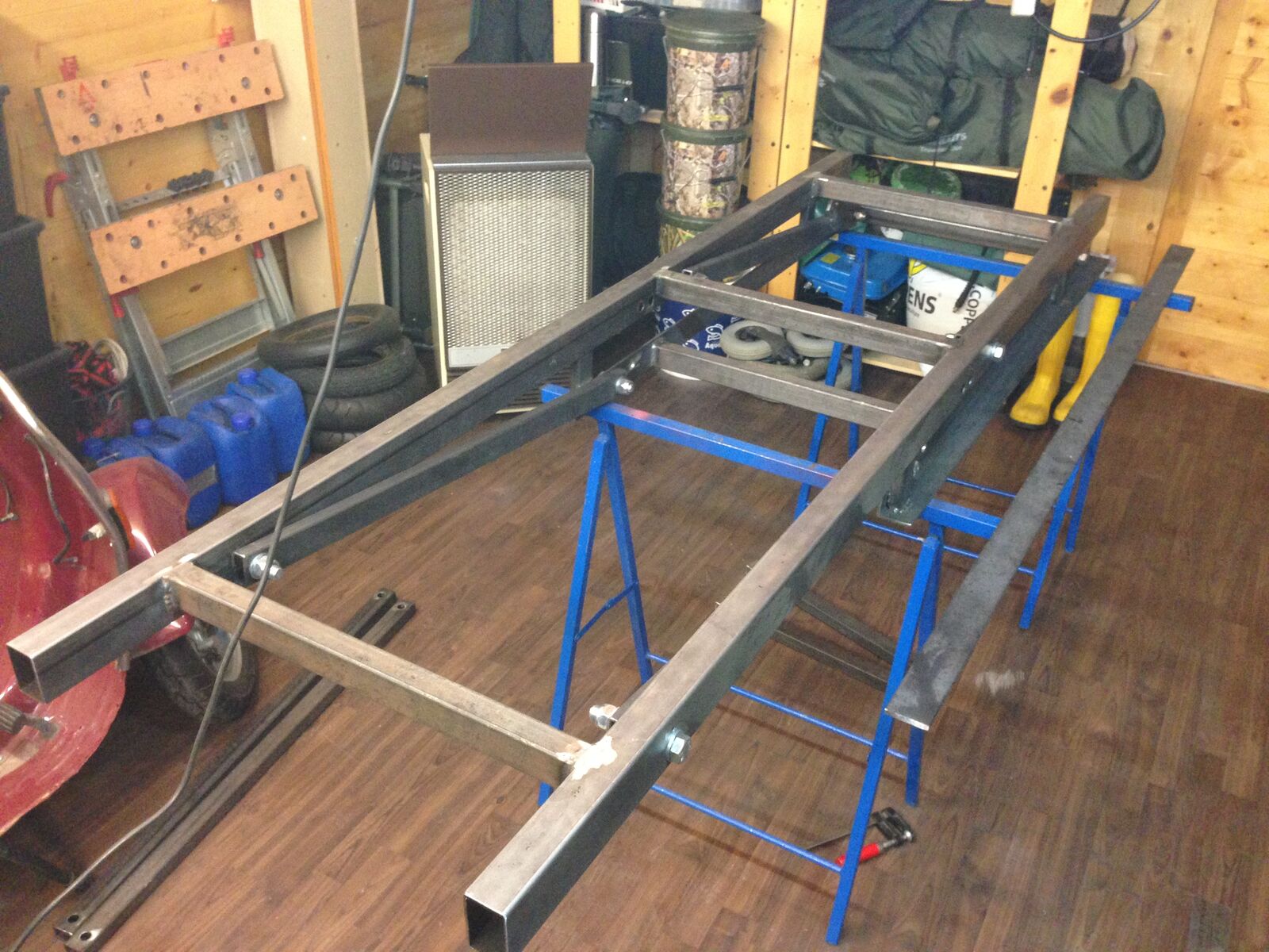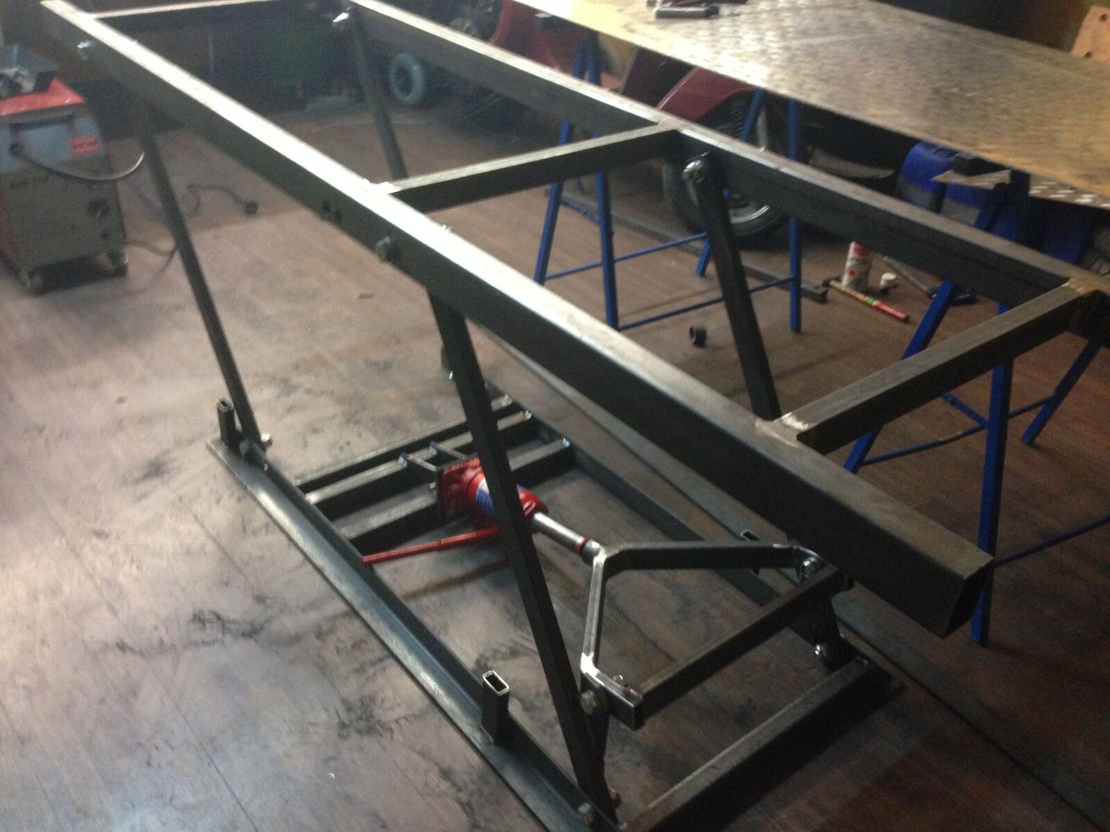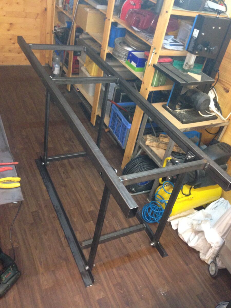 Entschieden habe ich mich dann für die 2. Variante, weil ich der Meinung bin das sie Stabiler ist wie dir erste und auch mehr Möglichkeiten bietet den Roller zu Reparieren.Da ich ja leider keinen Plan für einen selber Bau im Internet gefunden habe, machte ich mich selber ans Werk und zeichnete mal drauf los. Nach etwa 10 Stunden Arbeit stand der Plan für meine Hebebühne und es ging an die Arbeit. Die Profile habe ich Günstig bei einem Händler in Slowenien bekommen und der hat mir die auch gleich auf die richtige Länge zugeschnitten. Die Platte die oben drauf ist habe ich auch bei ihm bekommen. Auf diese platte wird dann noch ein ALU Riffelblech gelegt. Die Eisenplatte dient nur zur Stabilisierung da das Riffelblech nicht das billigste ist. Aber damit Ihr euch das ganze besser vorstellen könnt noch ein paar Daten.