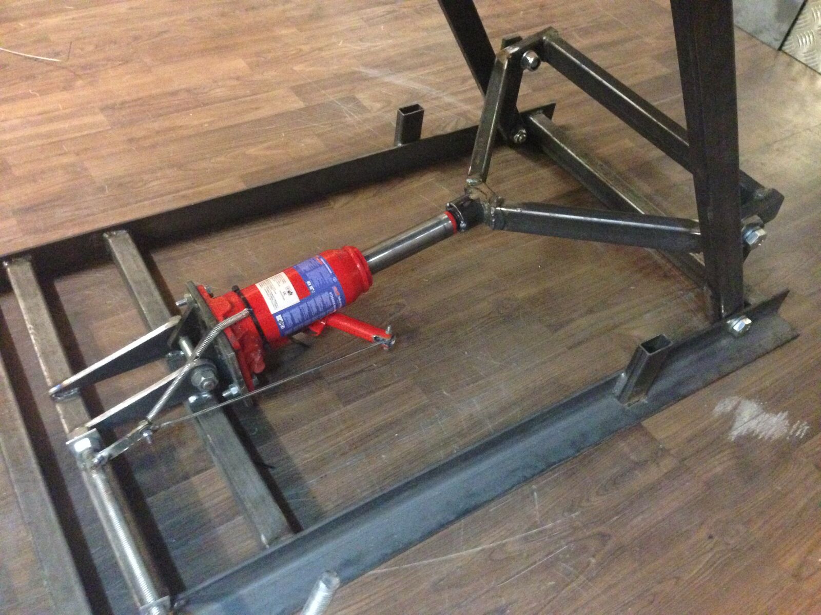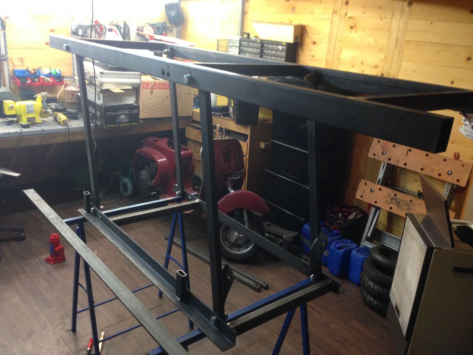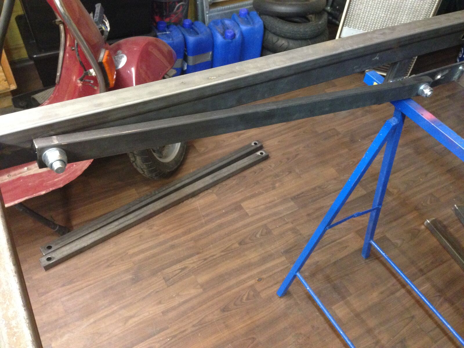 da ich vor einiger Zeit mir überlegt habe eine eigenen Hebebühne zu bauen, musste ich feststellen, dass es im Internet zwar viele Beiträge gibt, aber keine wirkliche Anleitung wie man eine Hebebühne baut. Zur Auswahl standen 2 verschiedene Typen. Die erste hebt den Roller am Trittbrett hoch, die zweite ist wie eine klassische Hebebühne und hebt den ganzen Roller, der am Hauptständer steht, hoch.