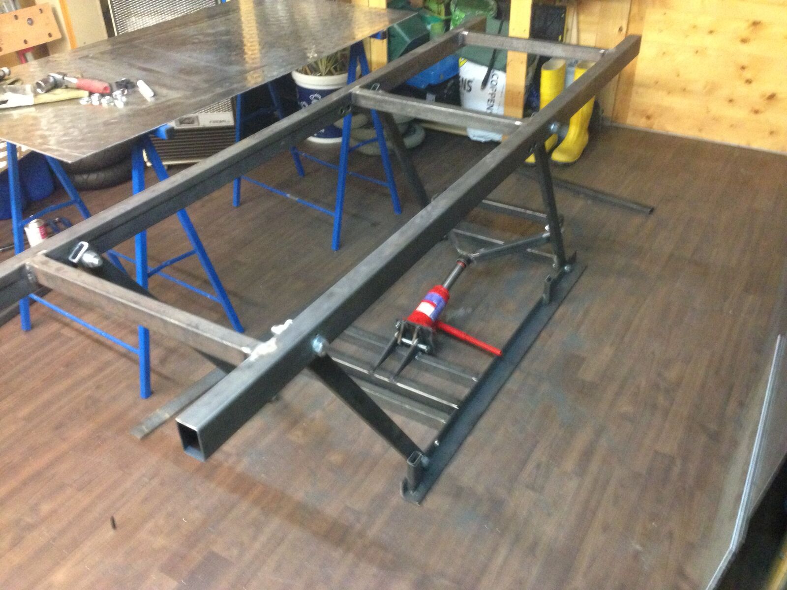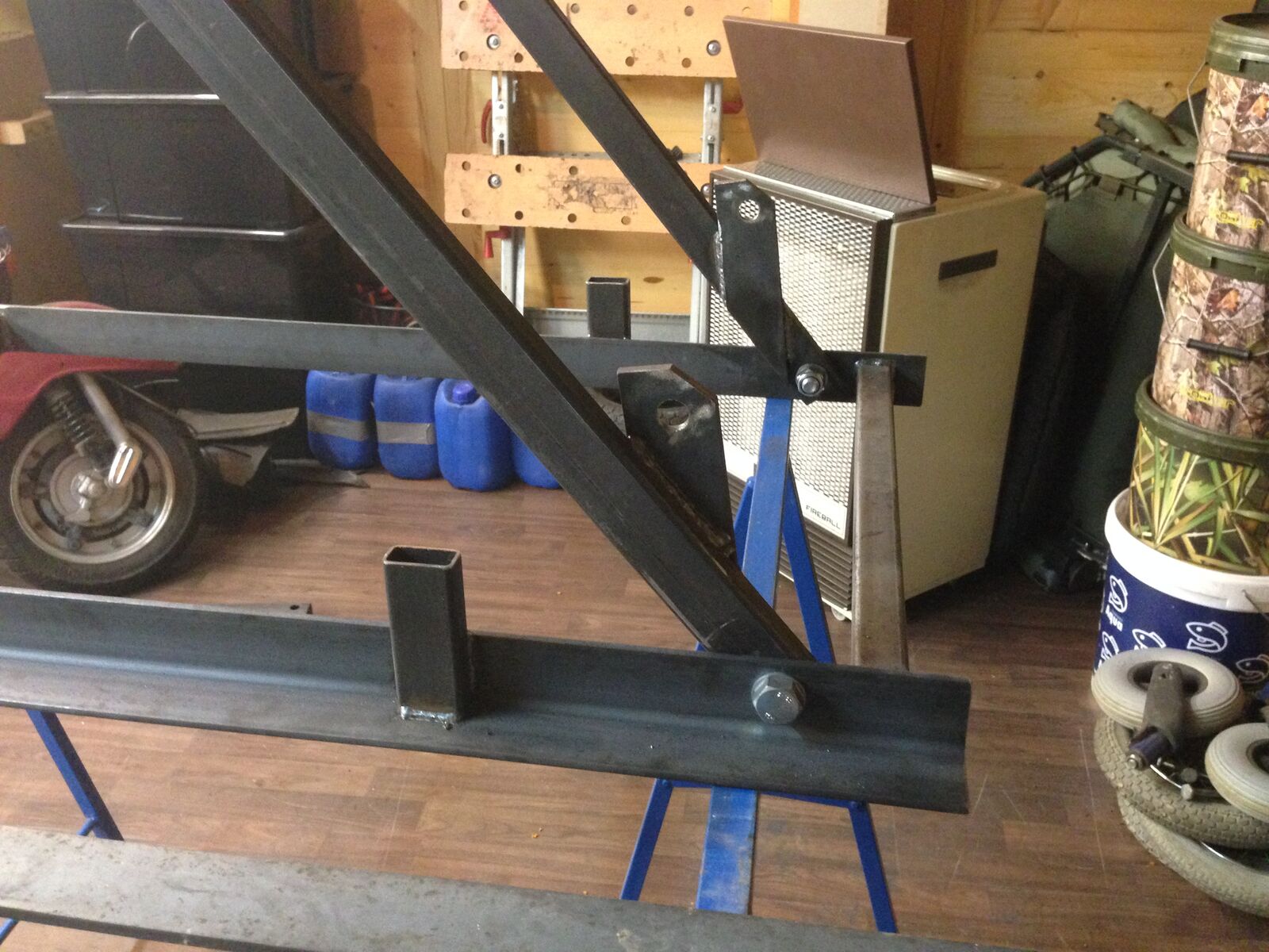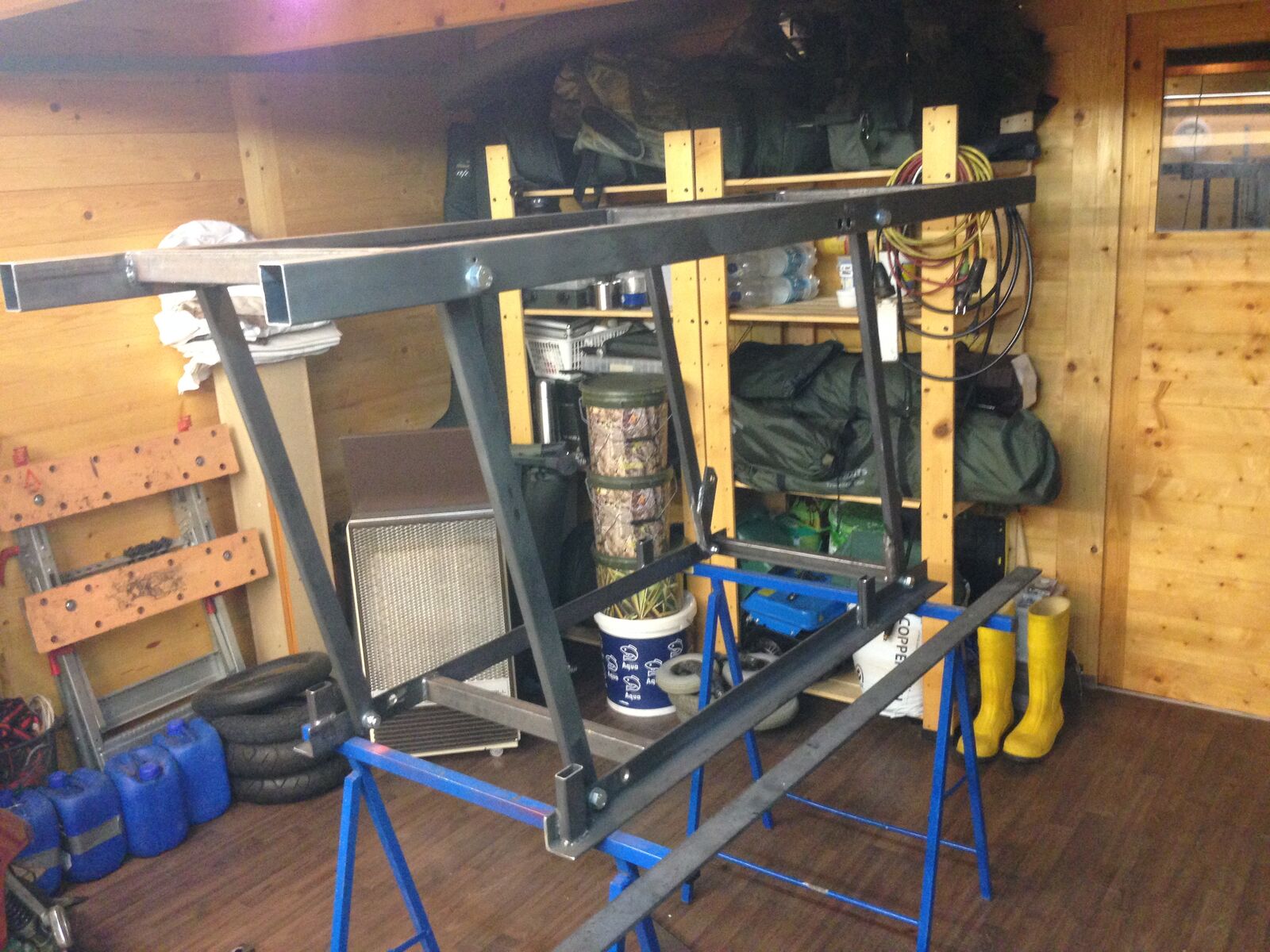 da ich vor einiger Zeit mir überlegt habe eine eigenen Hebebühne zu bauen, musste ich feststellen, dass es im Internet zwar viele Beiträge gibt, aber keine wirkliche Anleitung wie man eine Hebebühne baut. Zur Auswahl standen 2 verschiedene Typen. Die erste hebt den Roller am Trittbrett hoch, die zweite ist wie eine klassische Hebebühne und hebt den ganzen Roller, der am Hauptständer steht, hoch.